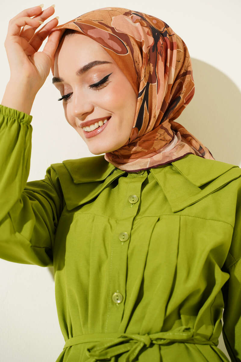 Yarım Düğmeli Ebruli Desen Elbise Sarı