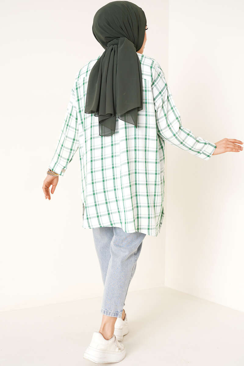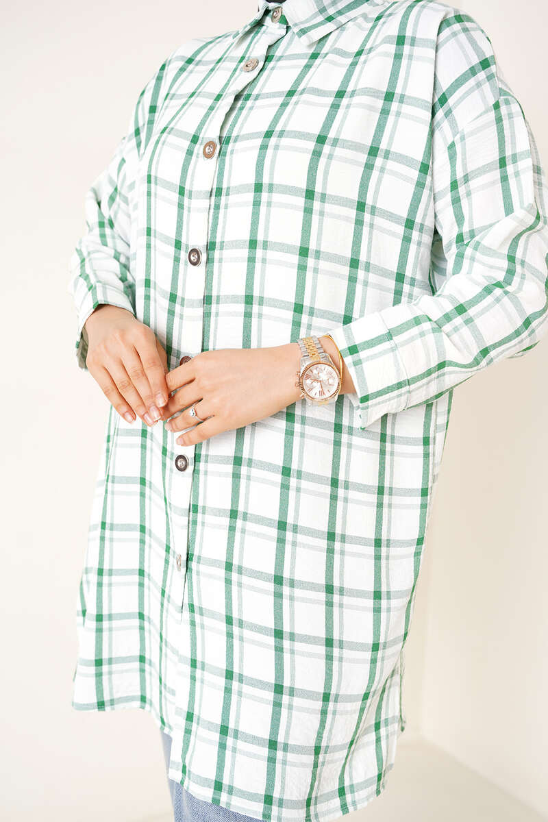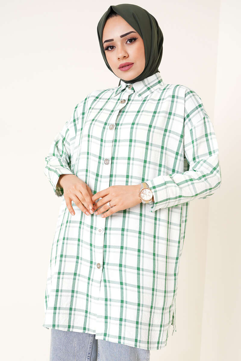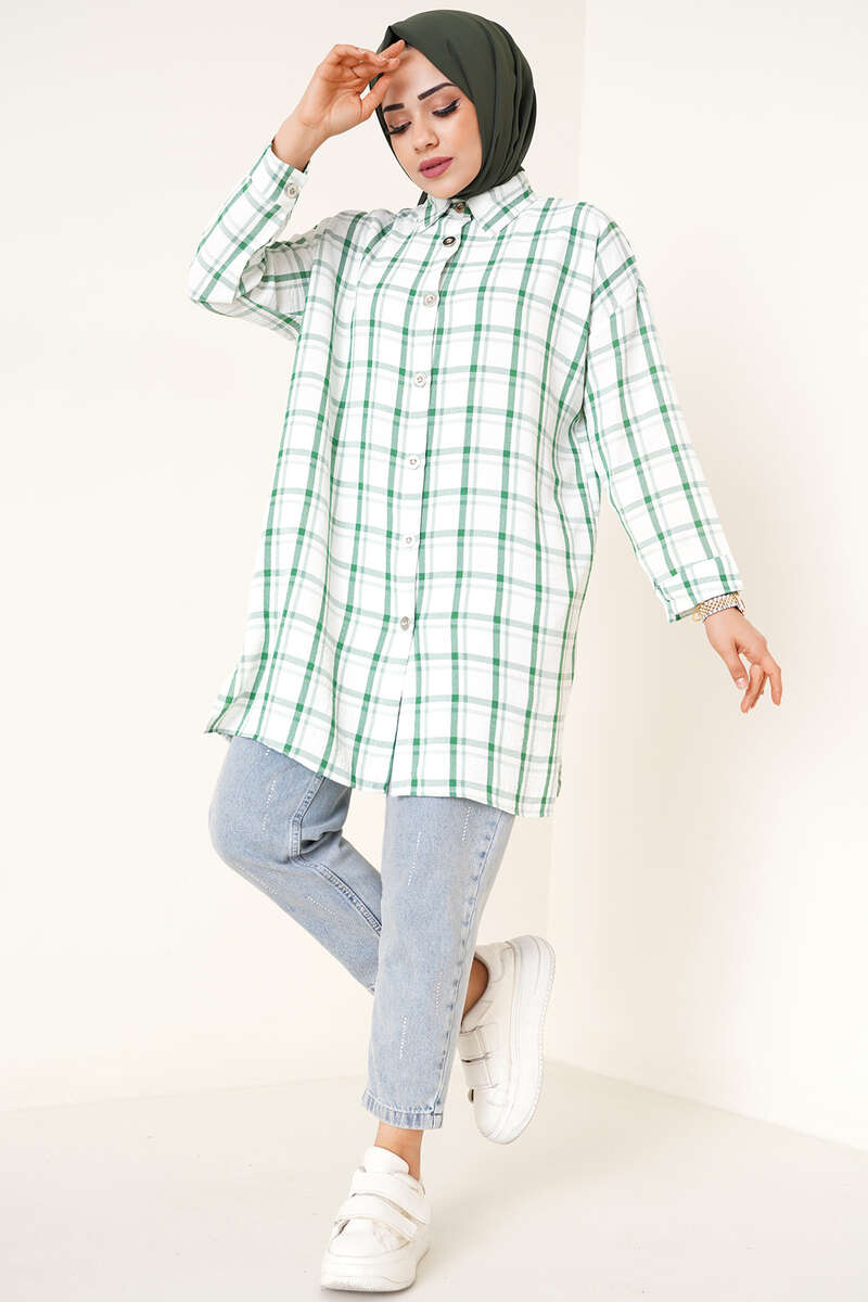 Yeni sezon ayrobin gömleğimiz ekose desenlidir. Salaş görünümlüdür ve düşük omuz modeldir. Metal görünümlü düğmeleriyle dikkat çeken gömleğimizin etek uçları yırtmaçlıdır.