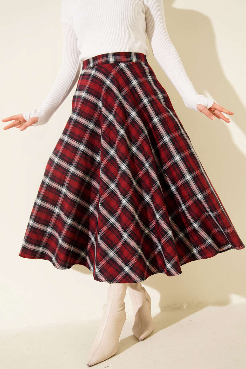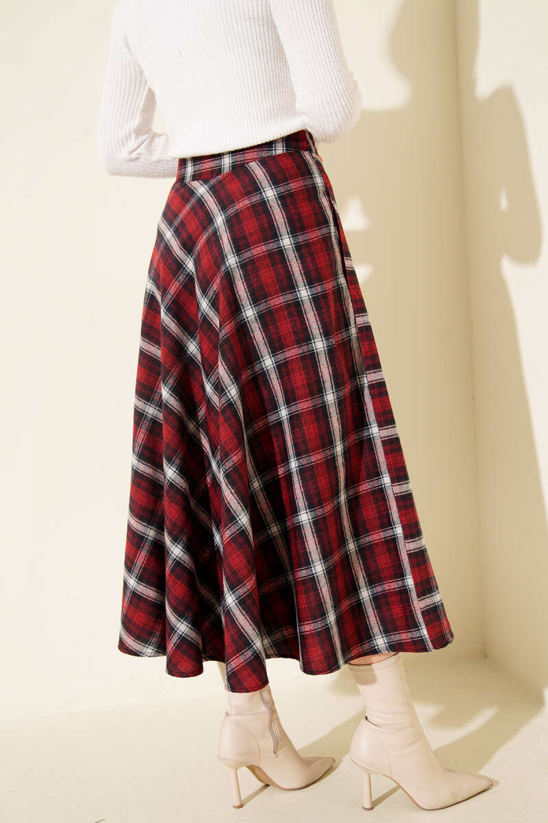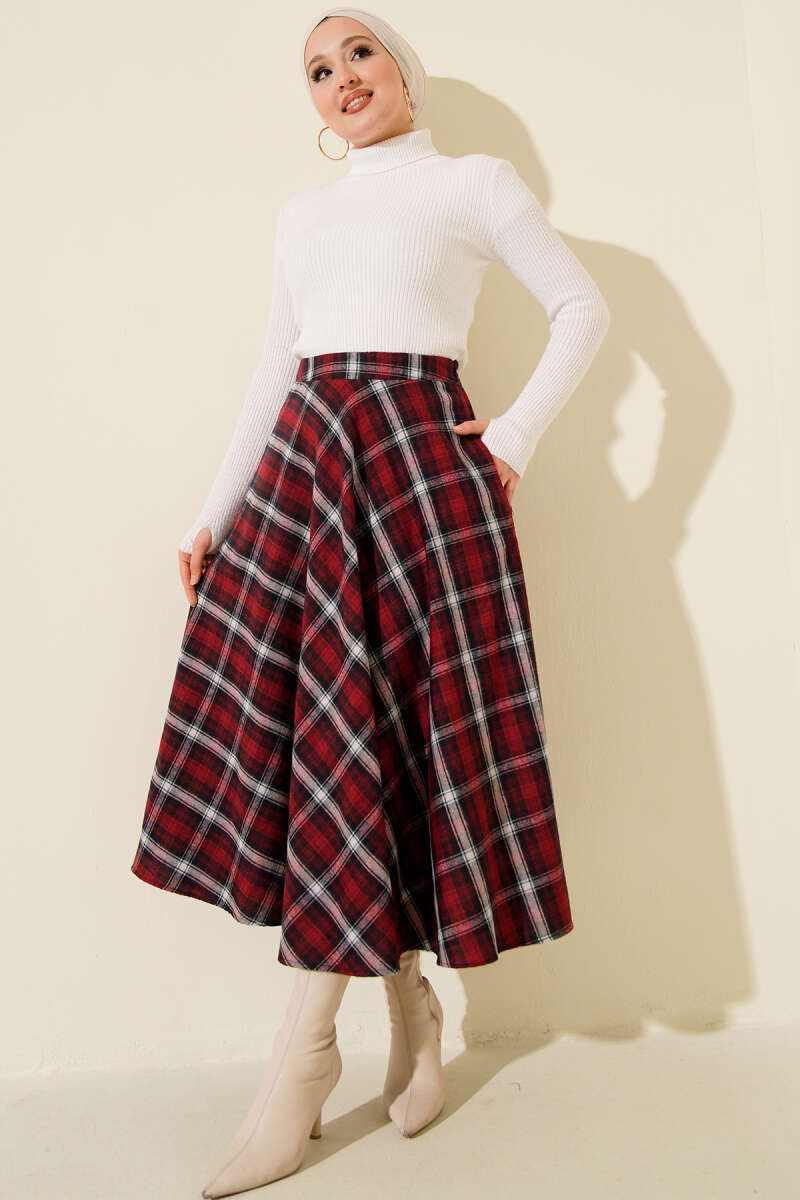 Ekose Desen Cepli Kaşe Etek Bordo
