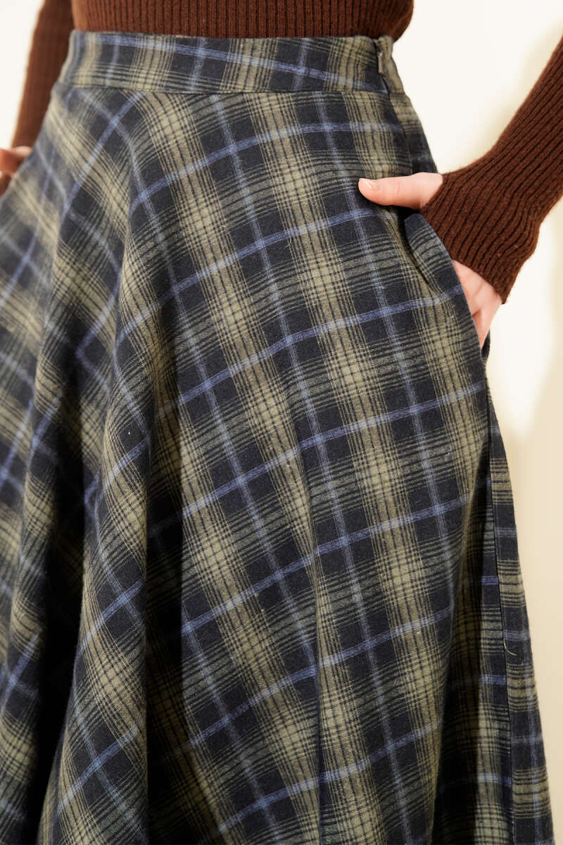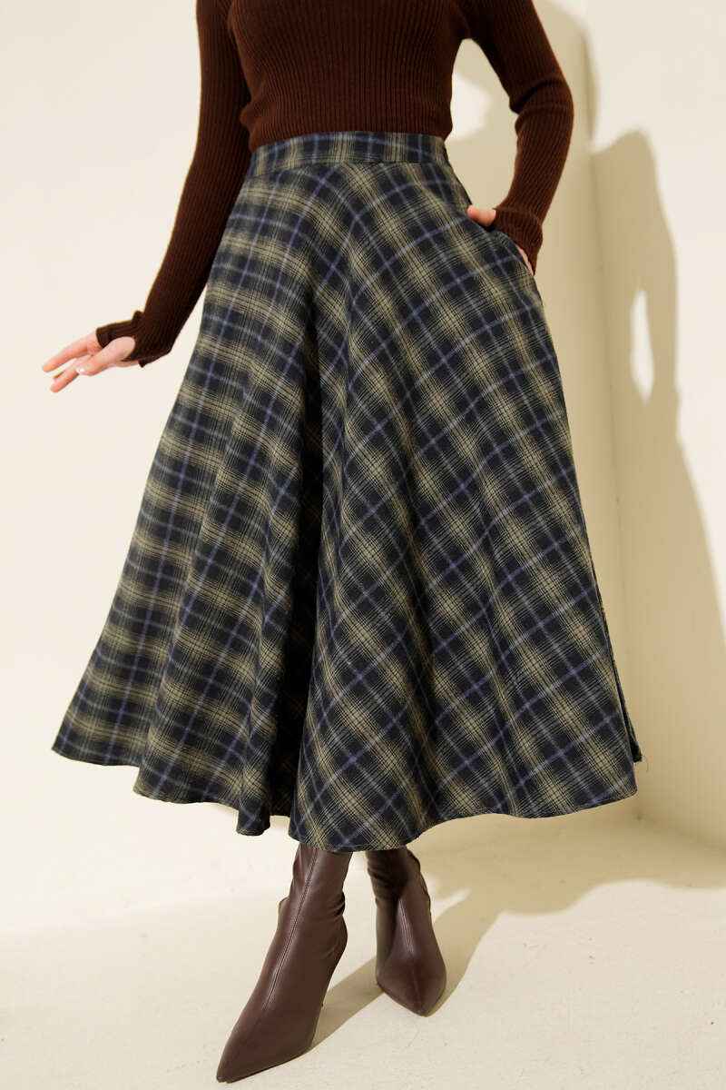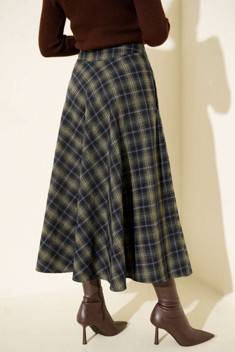 Kemerli Ekose Desen Kloş Etek Lacivert