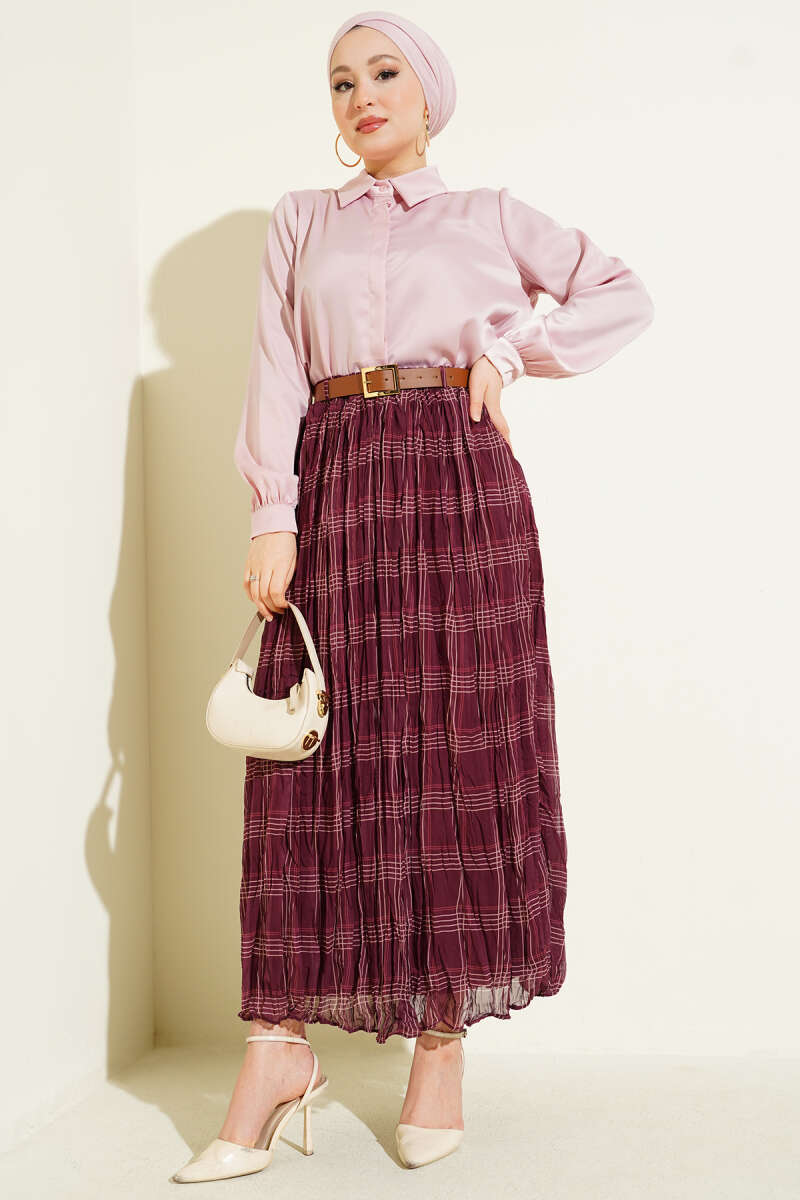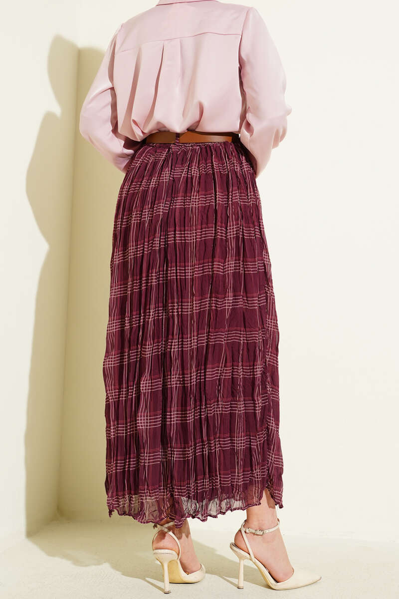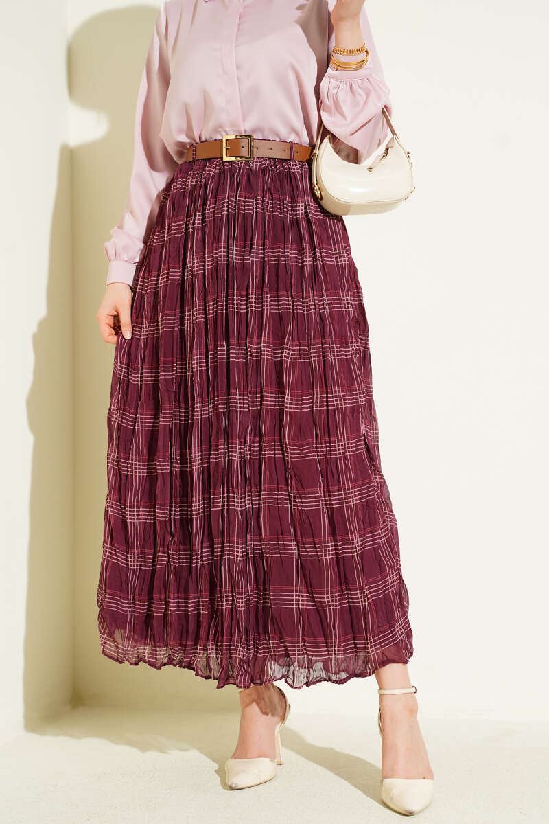 Ekose Desen Kırışık Şifon Etek Lacivert