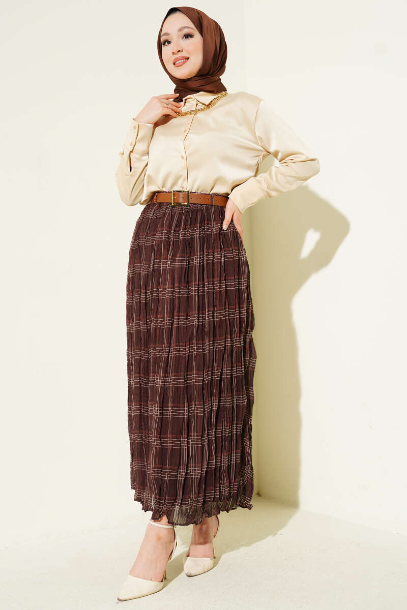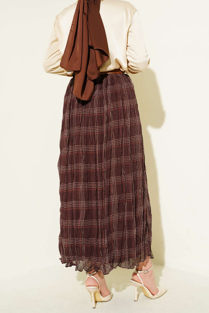 Ekose Desen Kırışık Şifon Etek Lacivert
