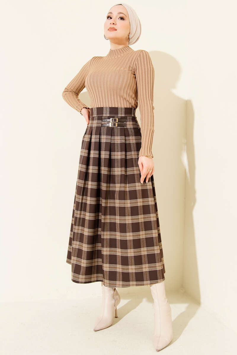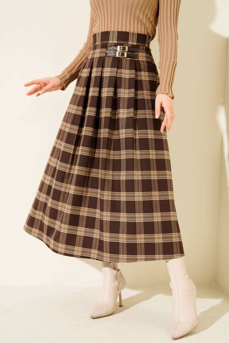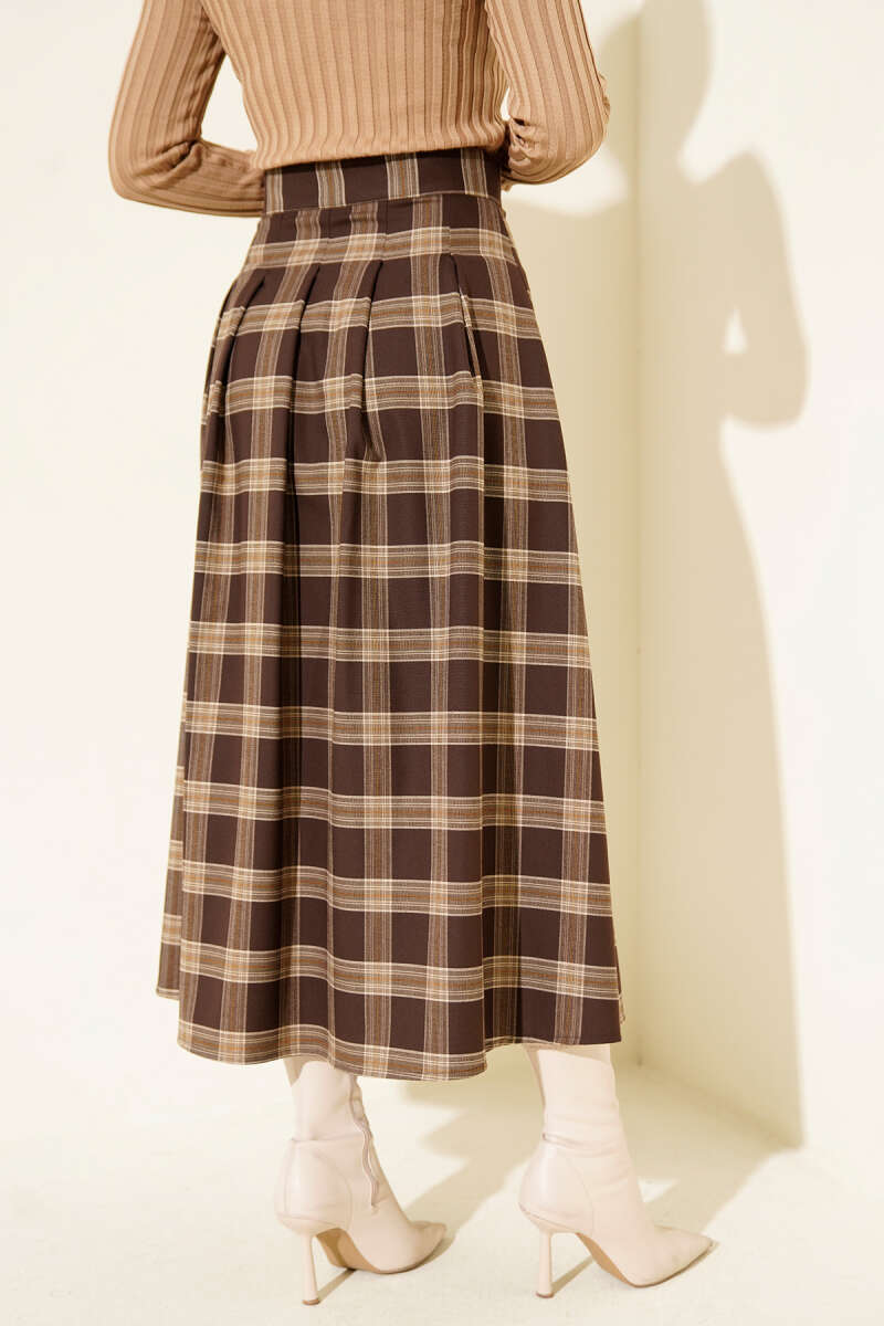 Ekose Desen Pileli Kloş Etek Kahve