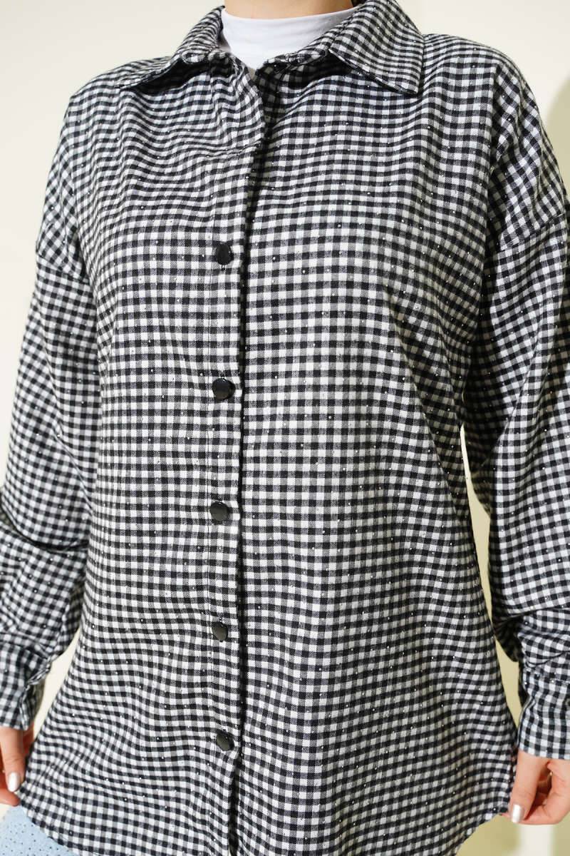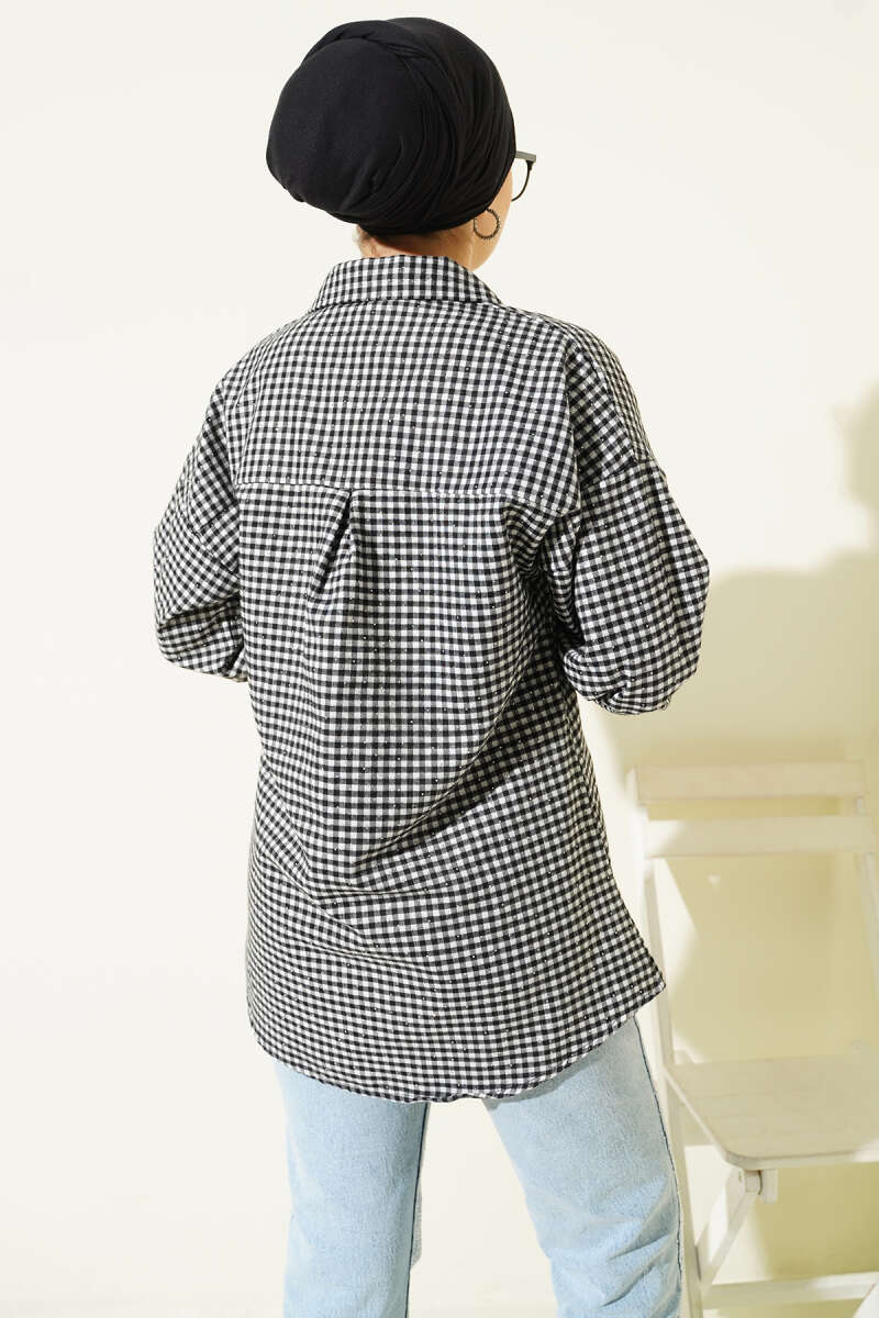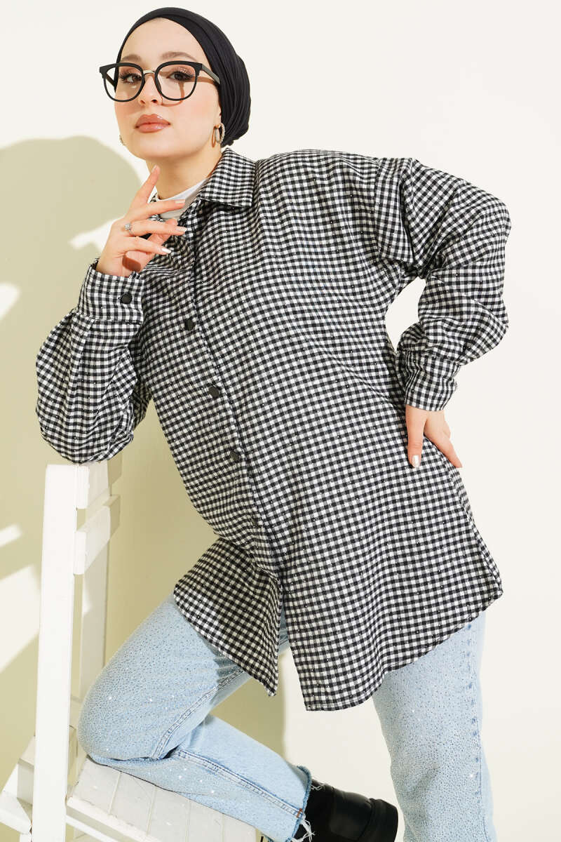 Ekose Desen Taşlı Gömlek Siyah