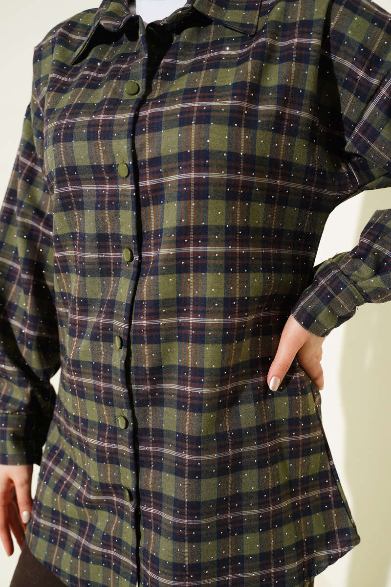 Ekose Desen Taşlı Gömlek Acı Kahve