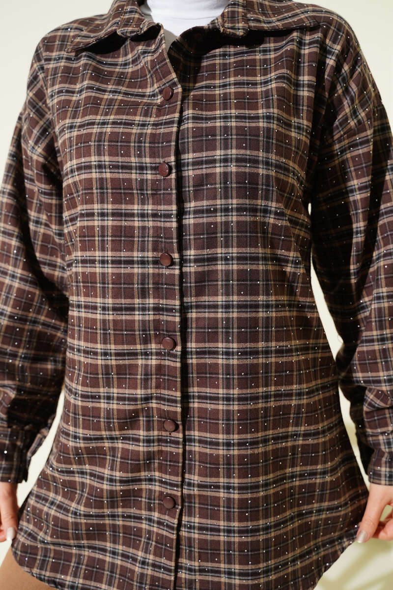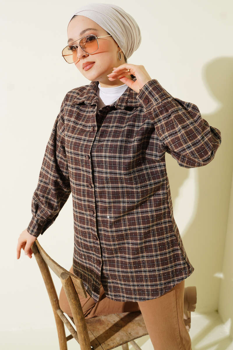 Ekose Desen Taşlı Gömlek Acı Kahve