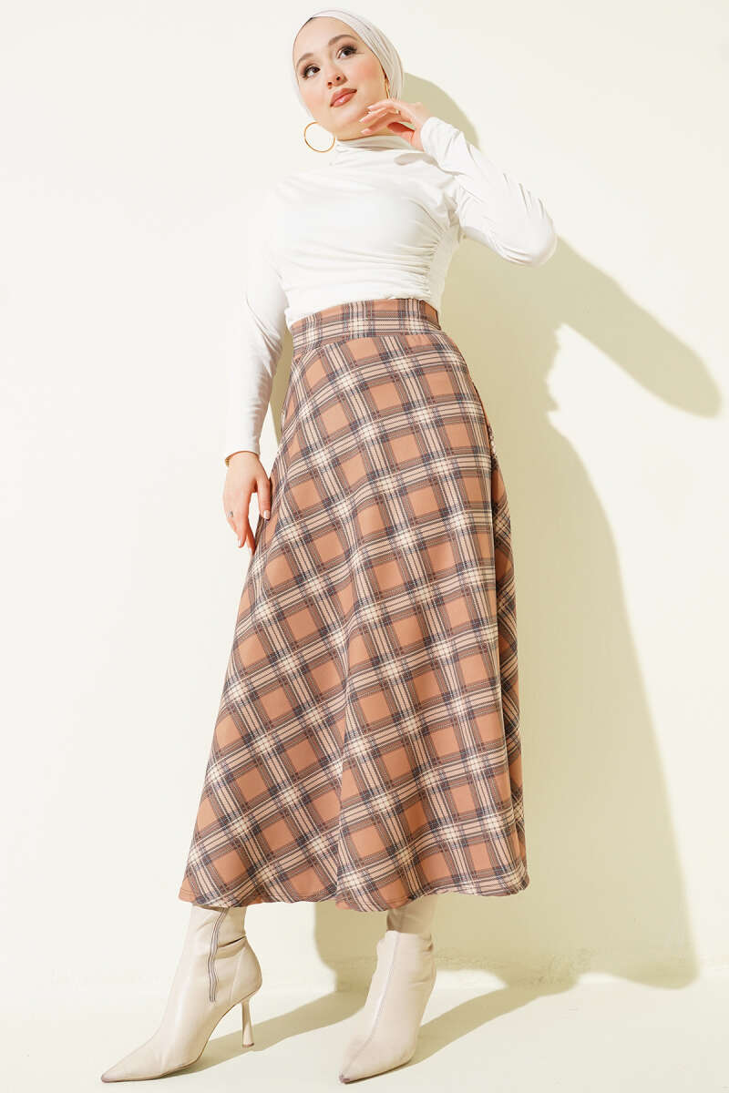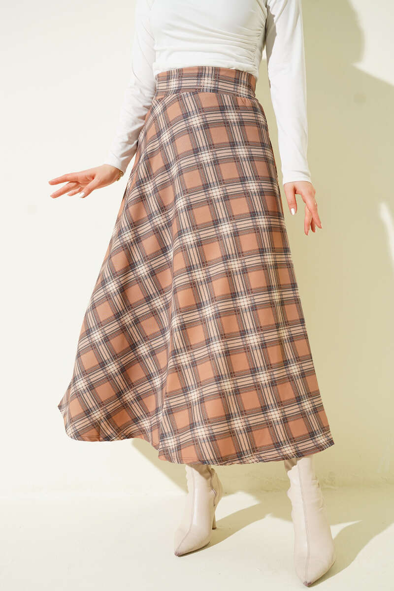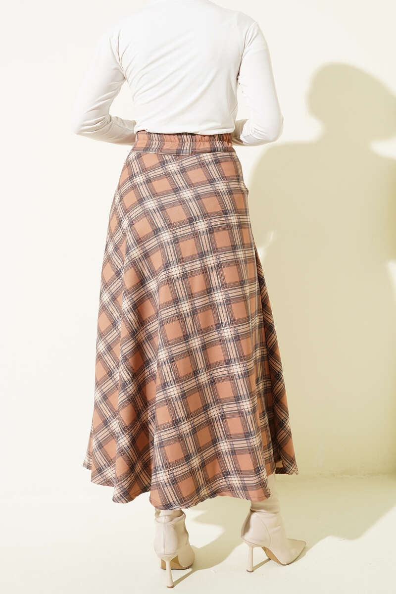 Ekose Desenli Bel Fermuarlı Etek Acı Kahve