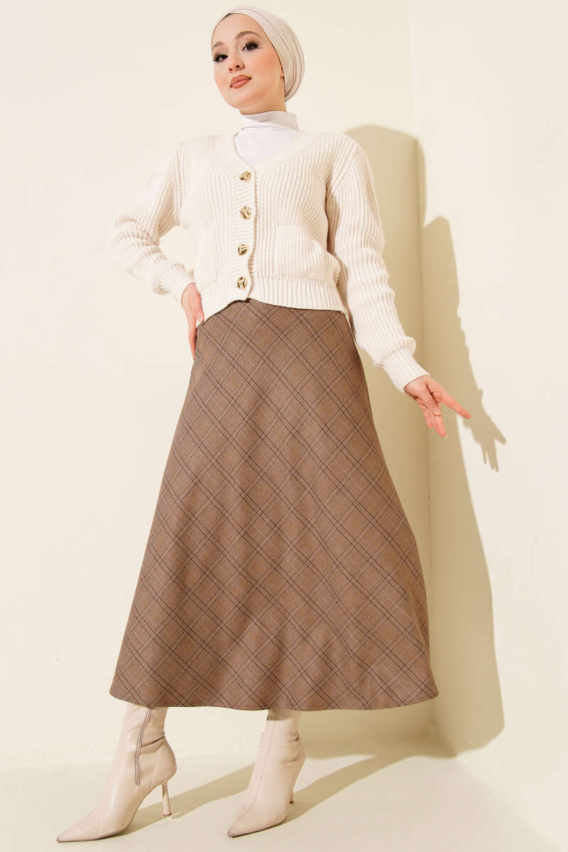 Kemer Aksesuarlı Ekoseli Etek Bordo
