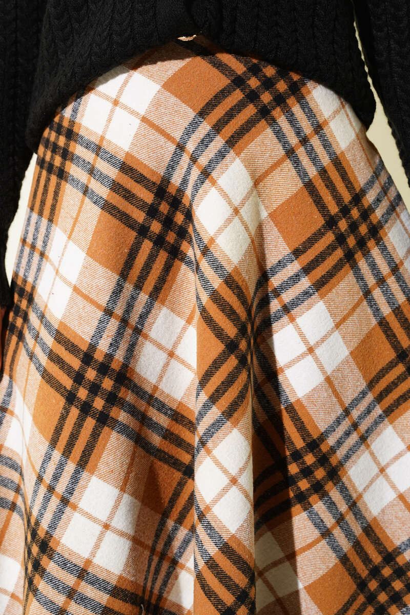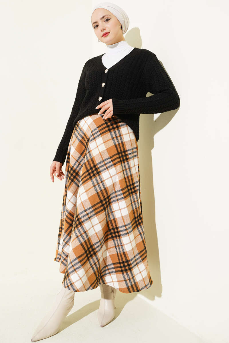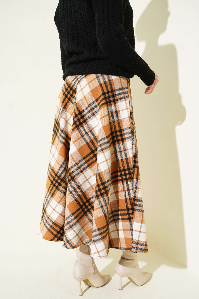 Ekose Desenli Bel Fermuarlı Etek Camel