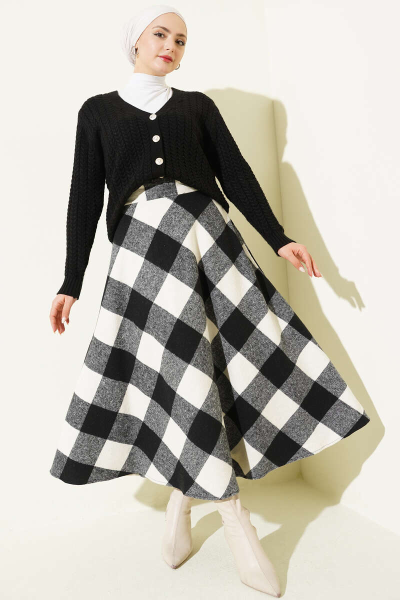 Ekose Desenli Bel Fermuarlı Etek Acı Kahve