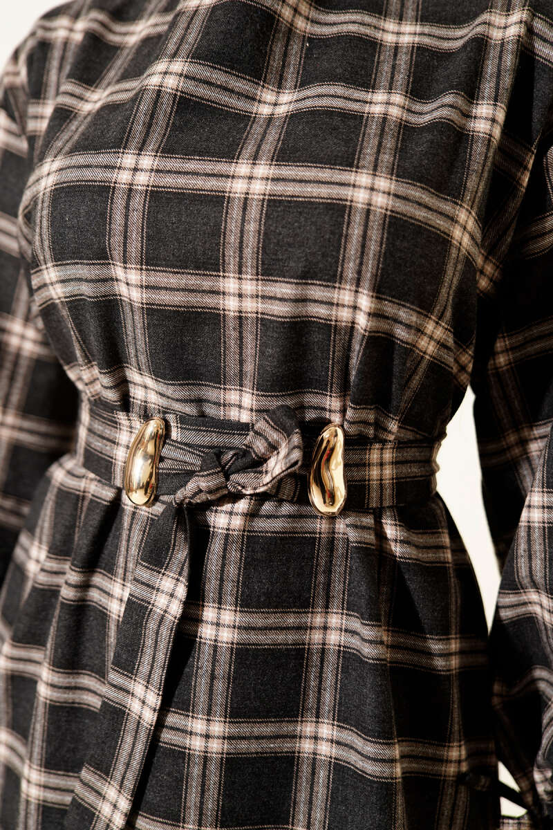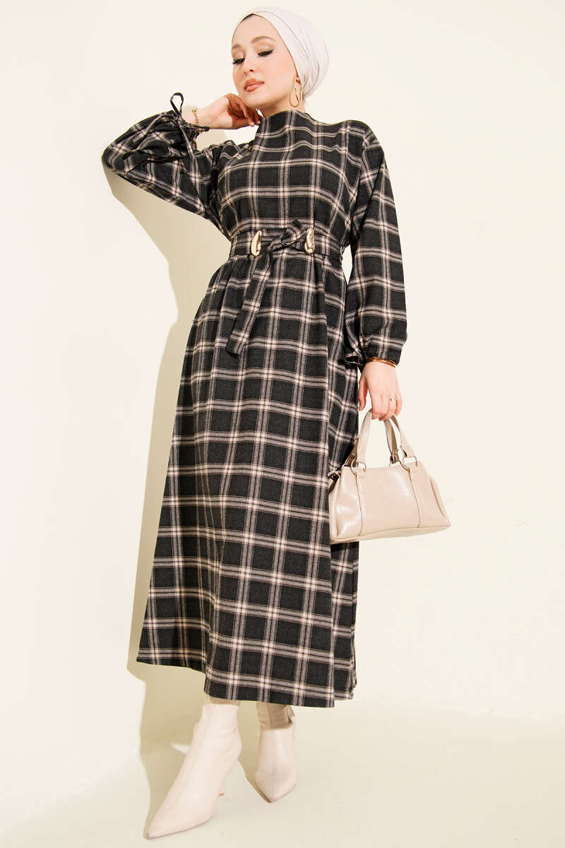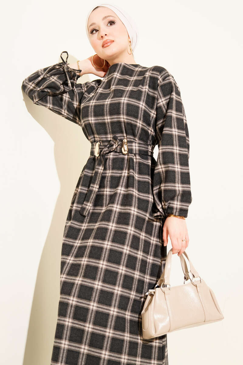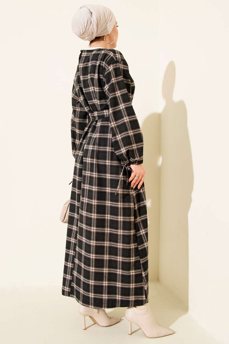 Metal Düğme Süslemeli Bağcıklı Elbise Füme