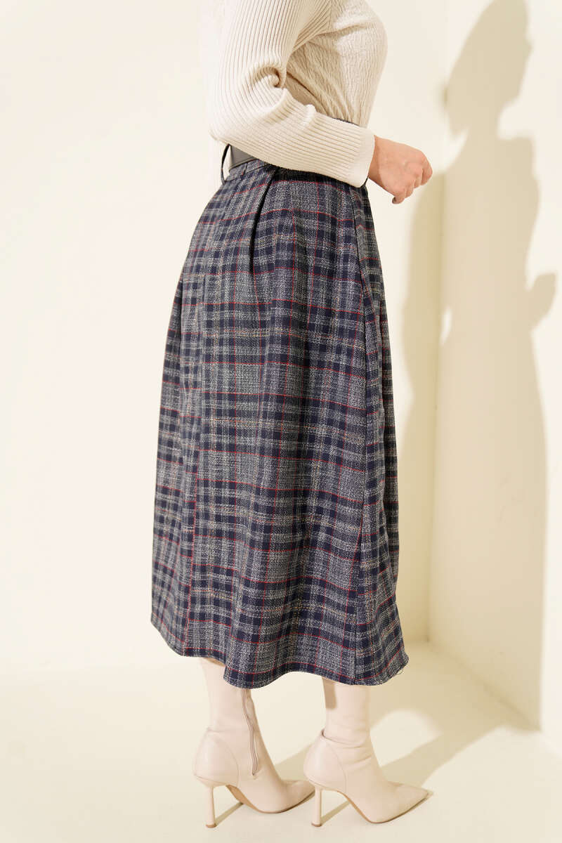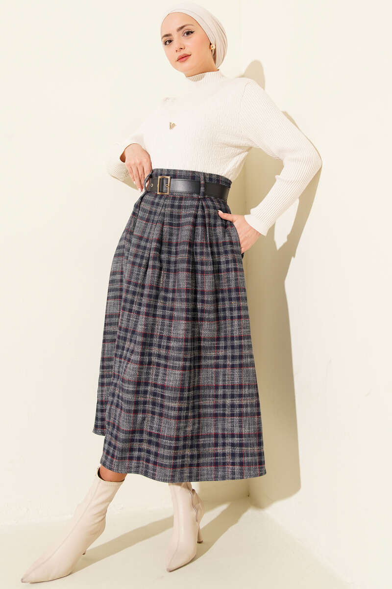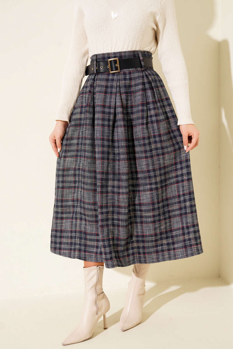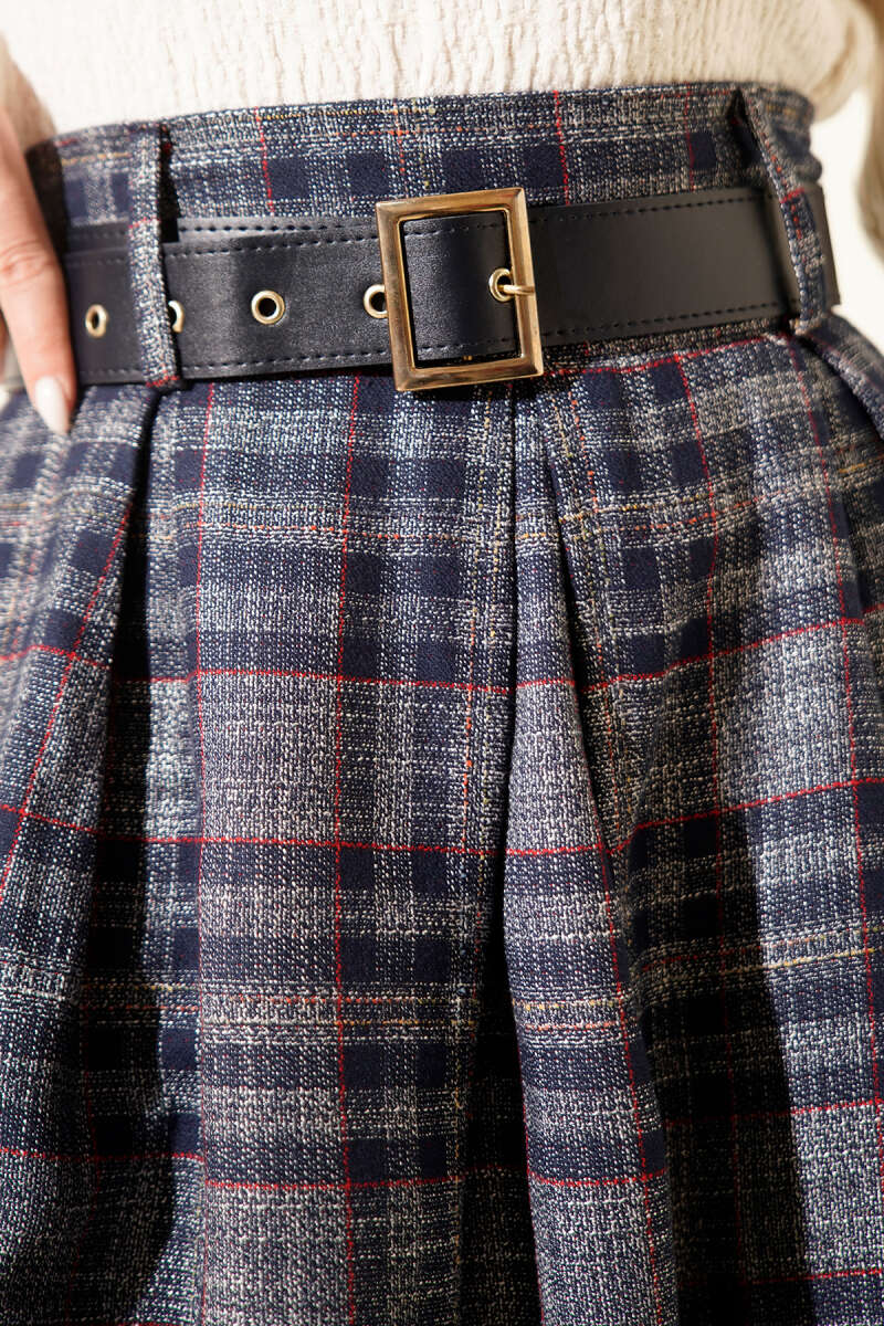 Beli Kemerli Lastikli Pileli Etek Lacivert