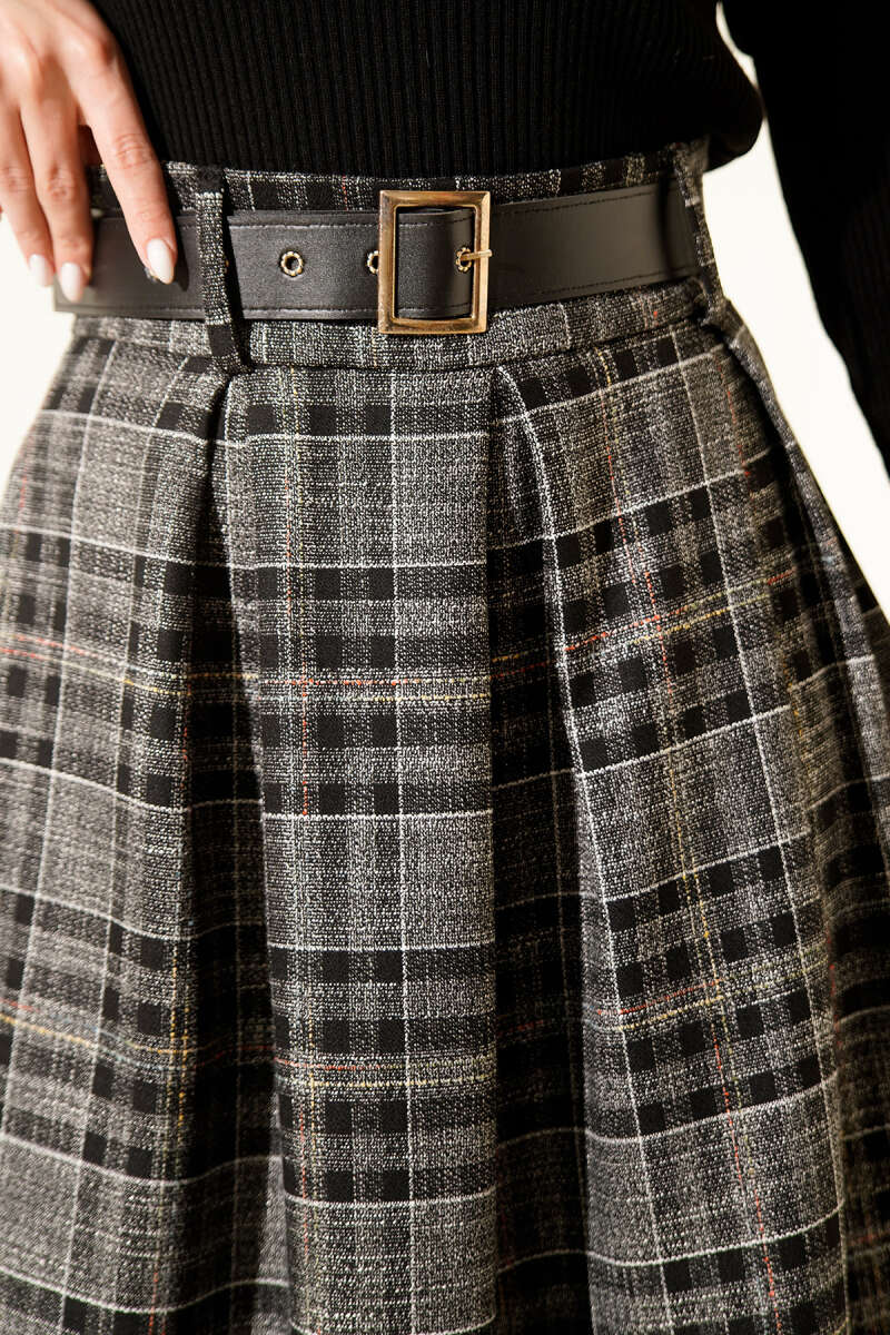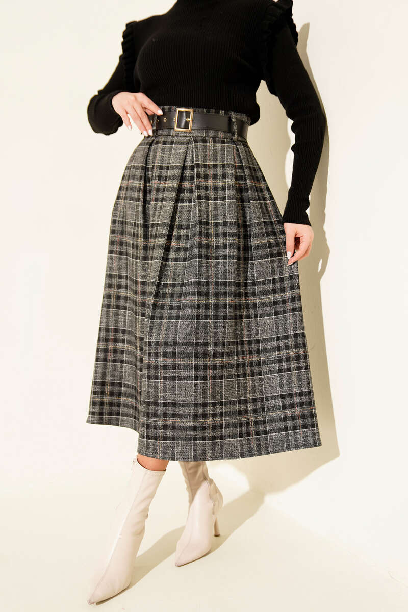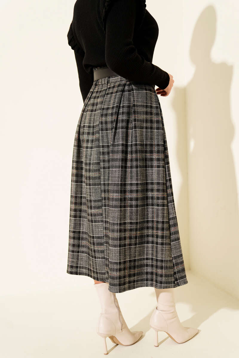 Ekose Desenli Düğmeli Kloş Etek Bordo