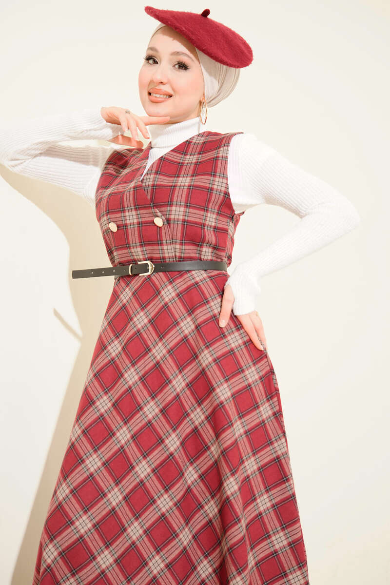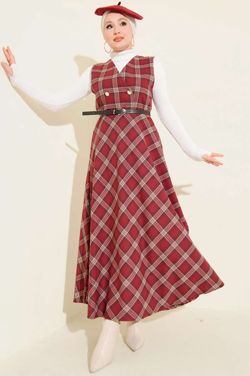 Ekose Desenli Kemerli Jile Elbise Siyah
