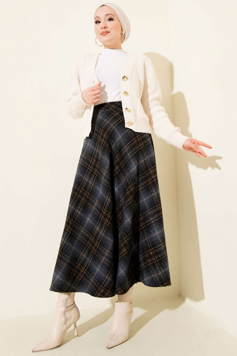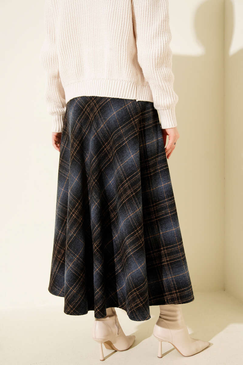 Ekose Desenli Kloş Kaşe Etek Gece Mavisi