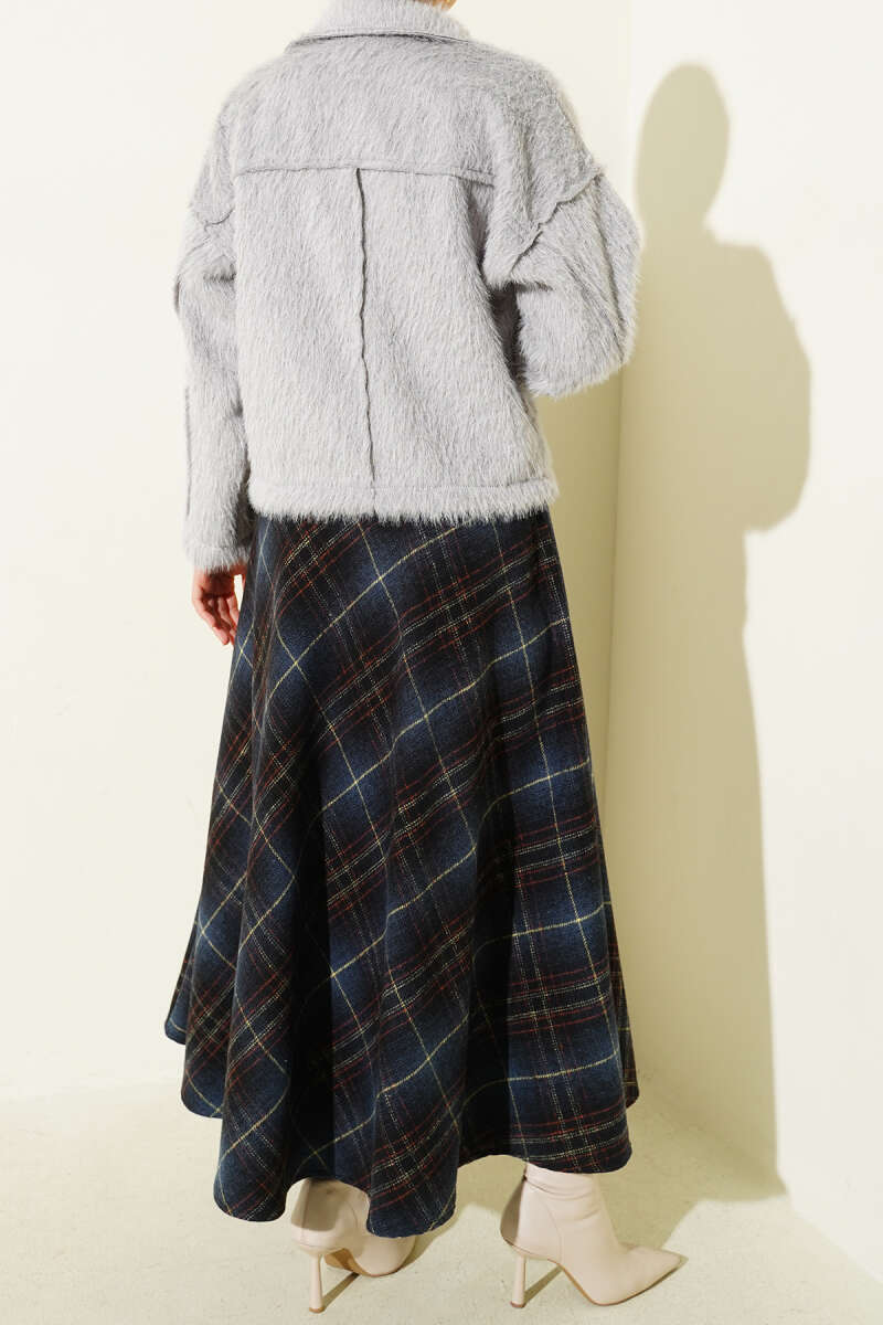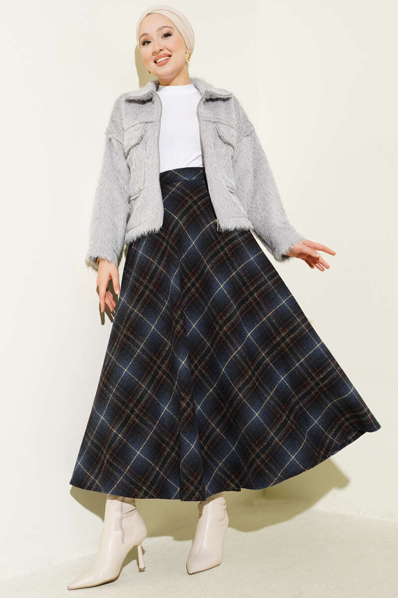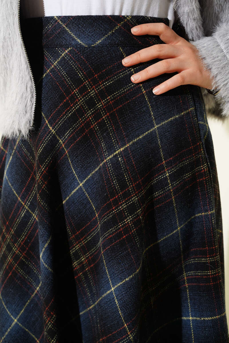 Ekose Desenli Kloş Kaşe Etek Lacivert