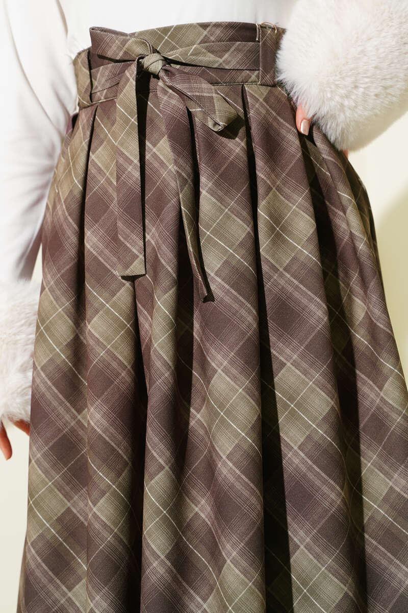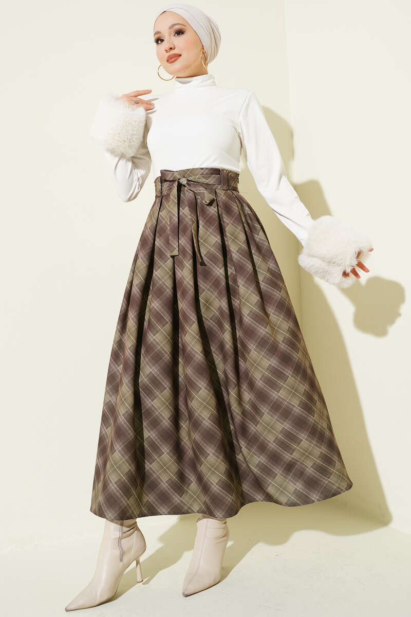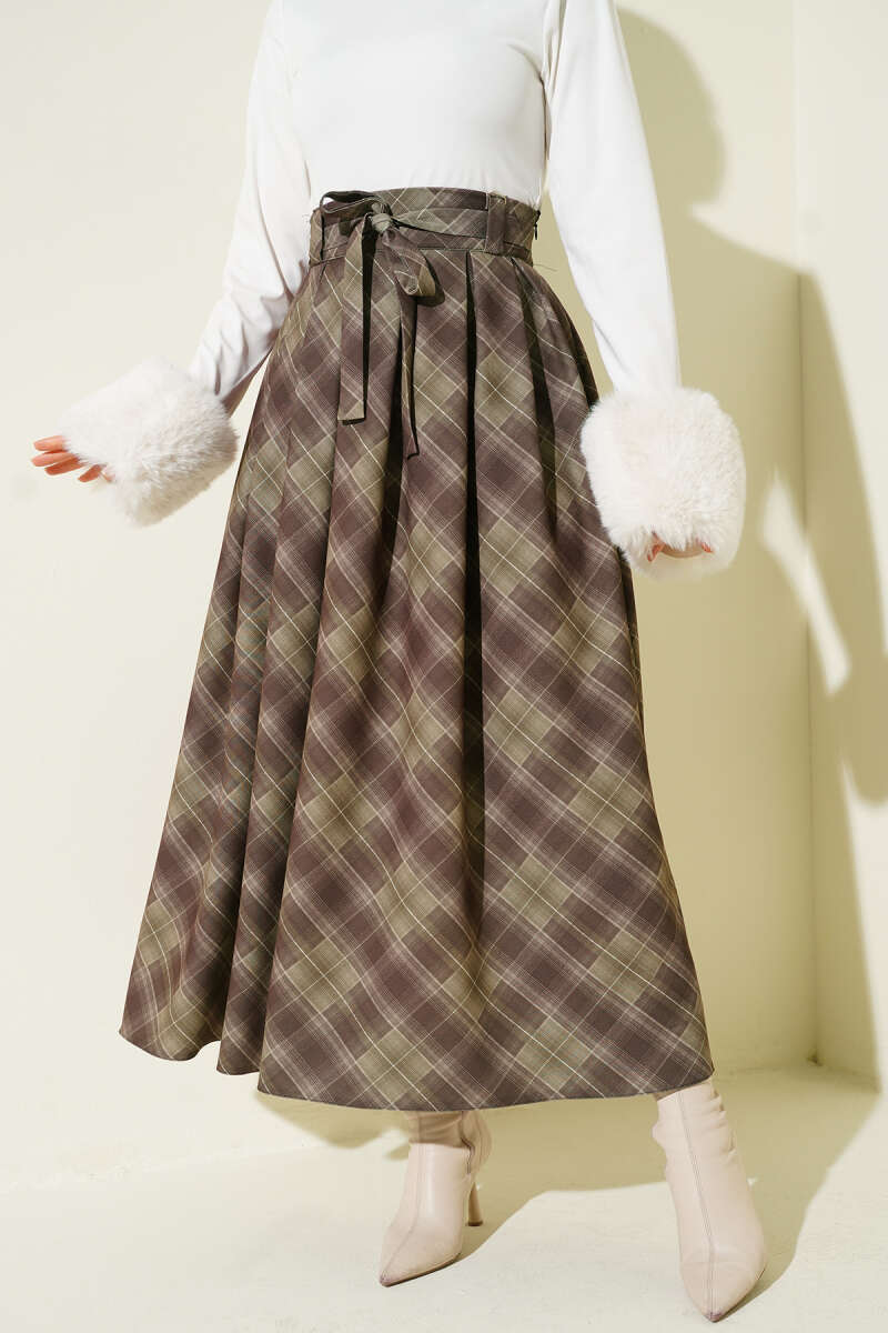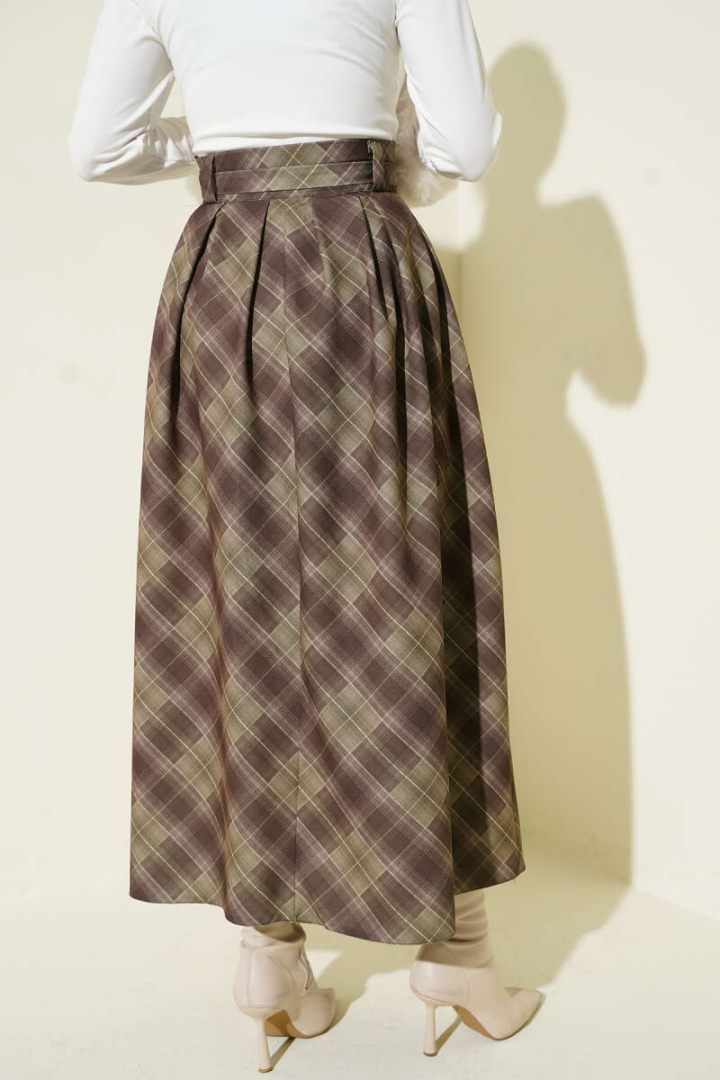 Ekose Desenli Fermuarlı Kaşe Etek Camel