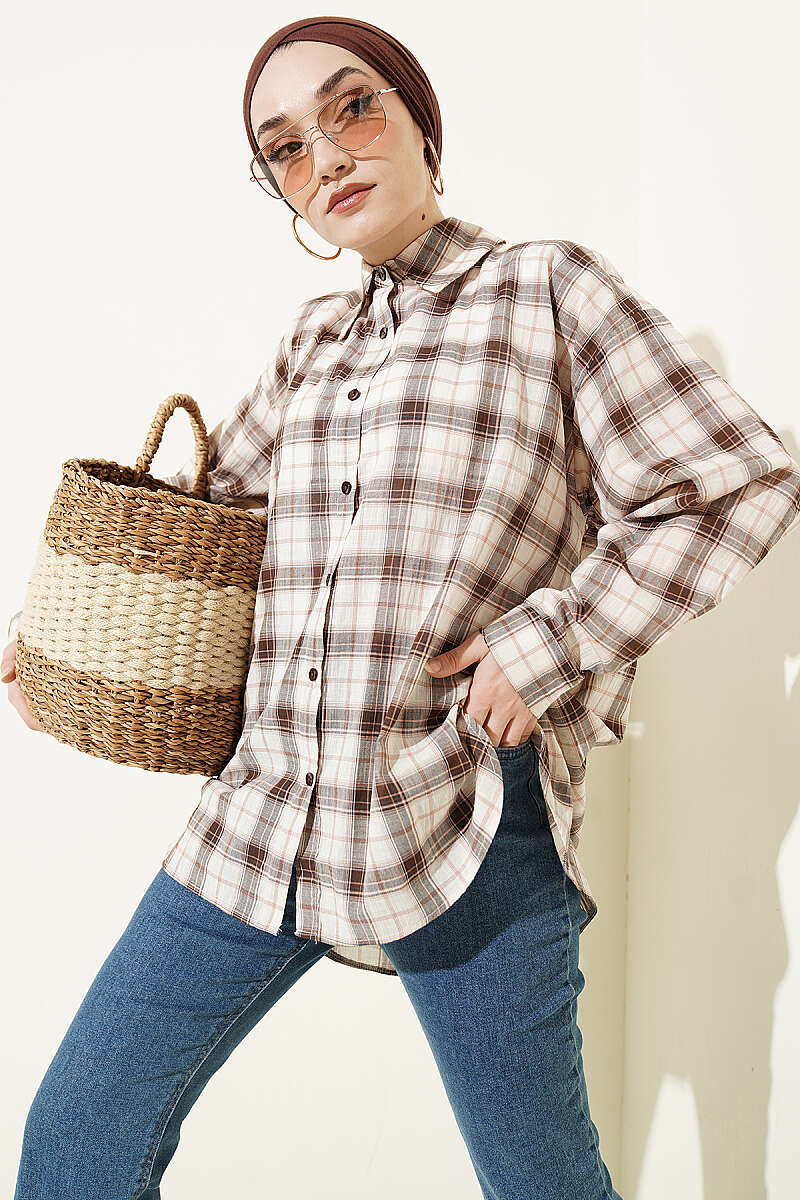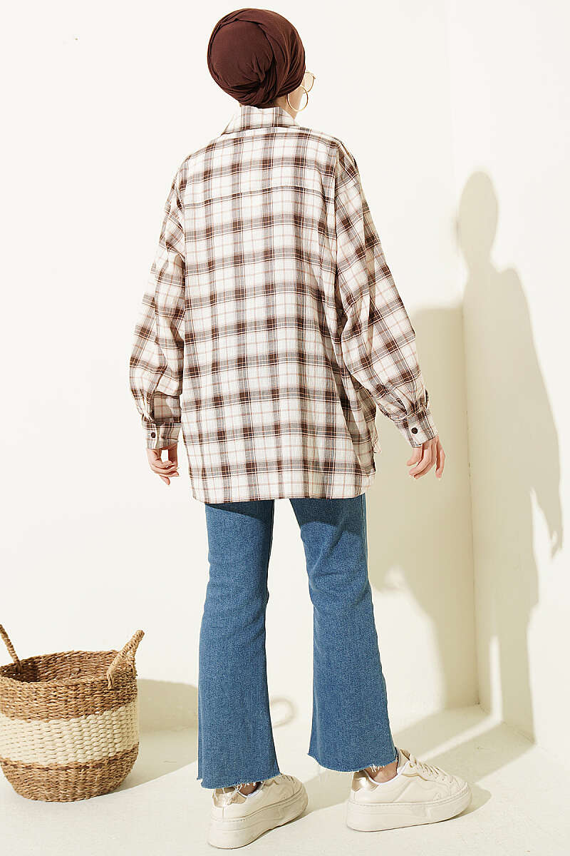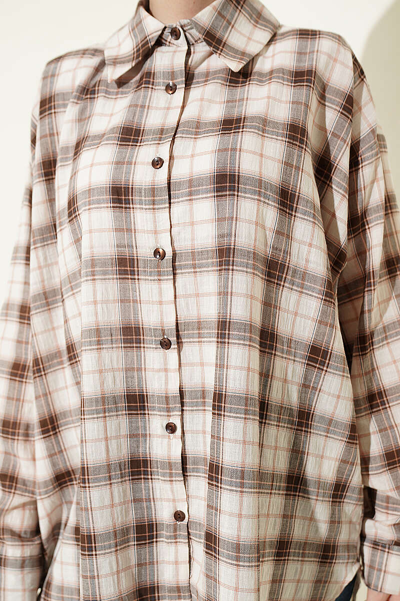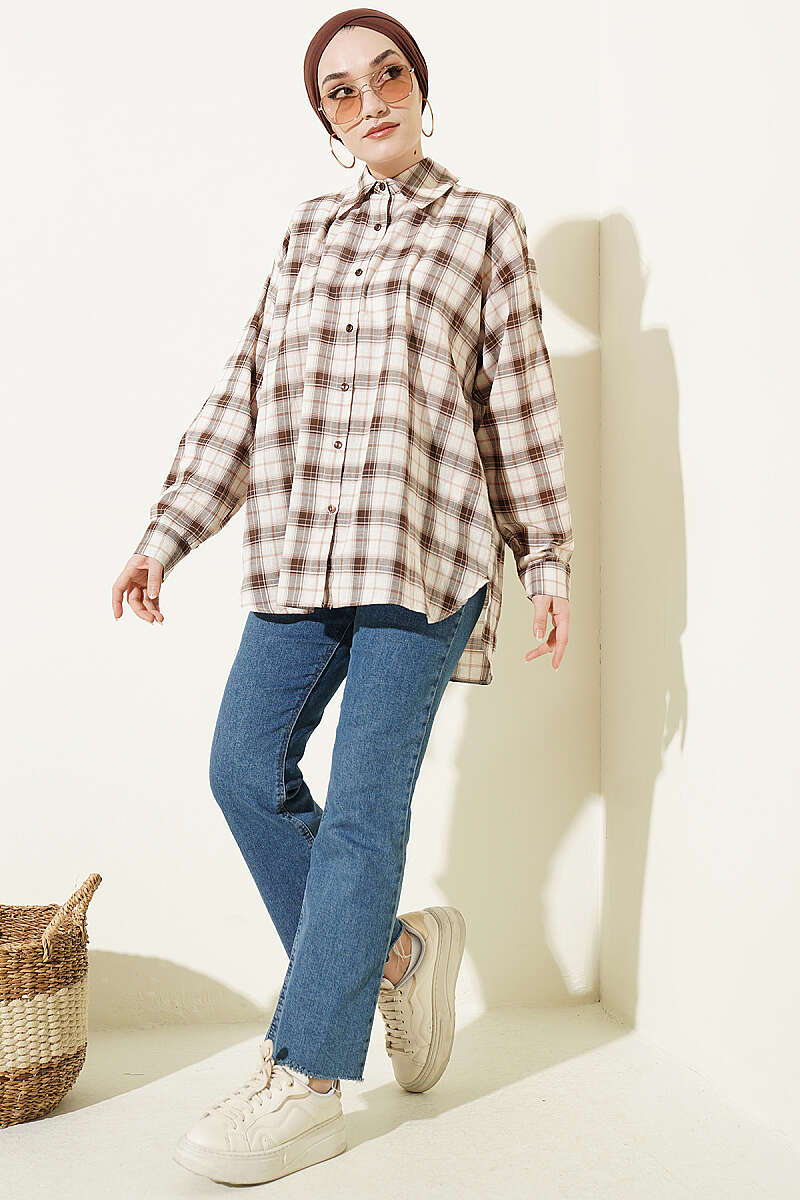 Ekose Desenli Salaş Gömlek Bej