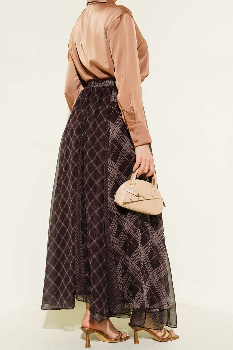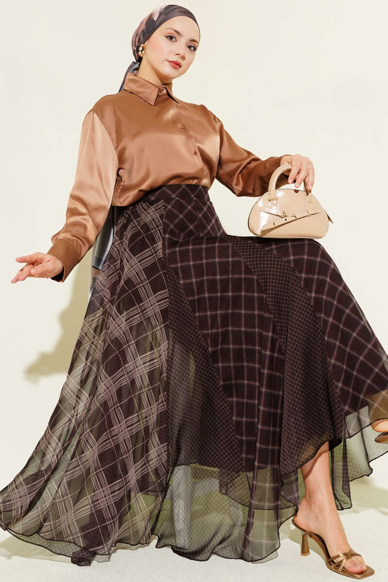 Ekose Desenli Şifon Kloş Etek Kahve