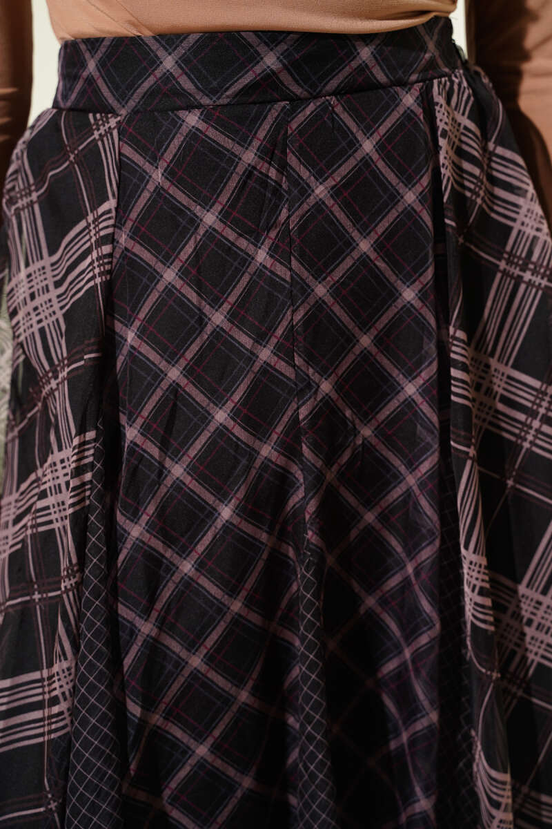Ekose Desenli Şifon Kloş Etek Mürdüm
