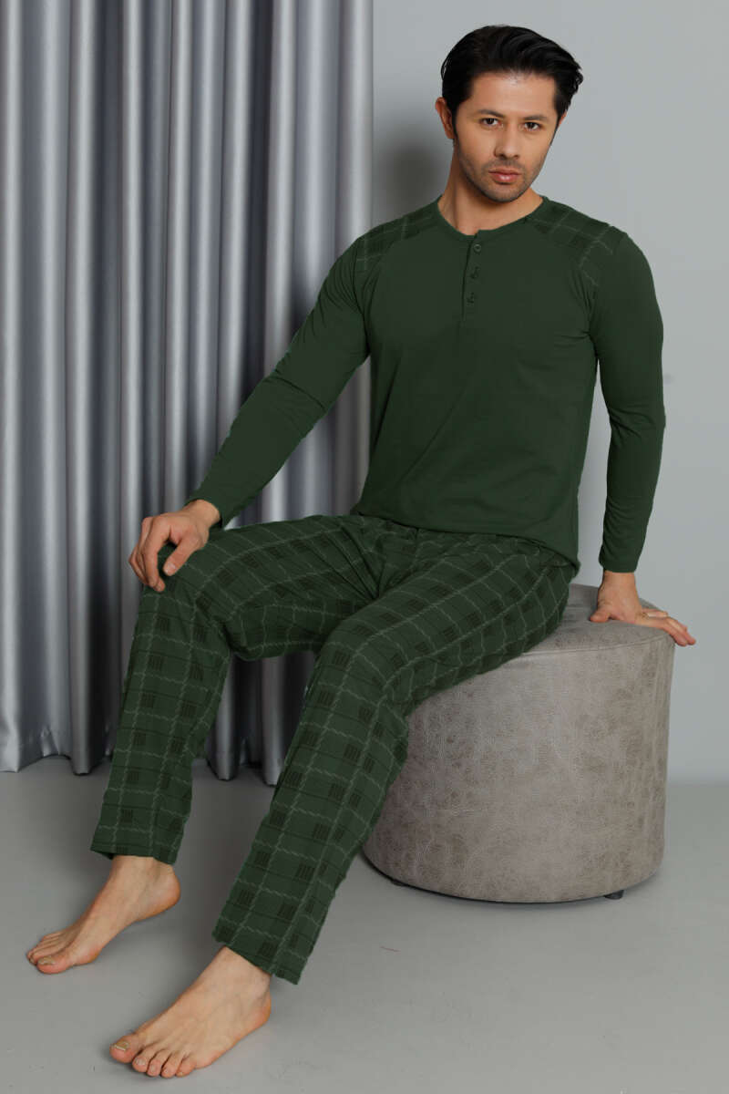 Ekose Detaylı Düğmeli Erkek Pijama Takımı Haki