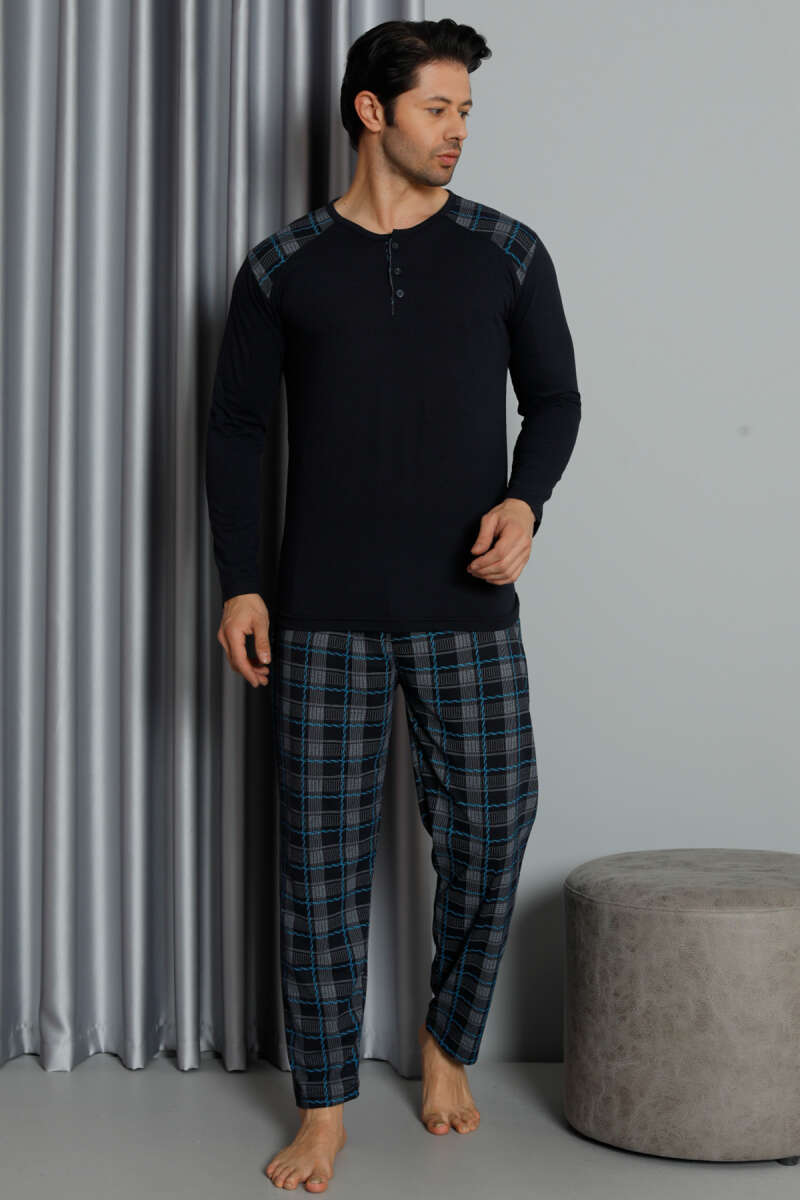 Ekose Detaylı Düğmeli Erkek Pijama Takımı Lacivert