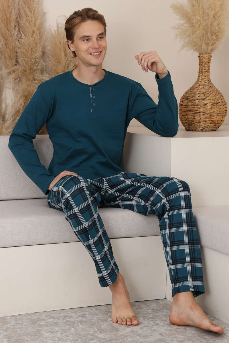 Ekose Detaylı Uzun Kol Erkek Pijama Takımı Petrol
