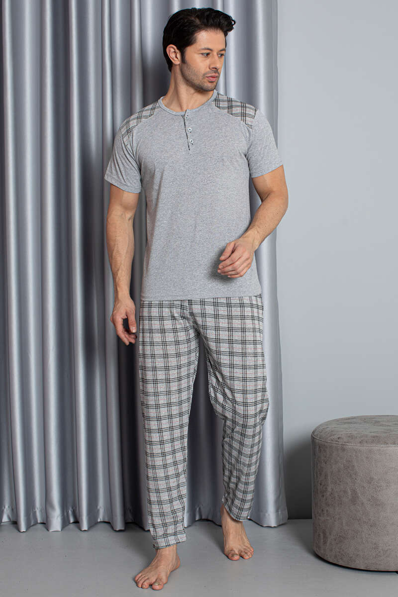 Ekose Garnili Kısa Kol Erkek Pijama Takımı Gri