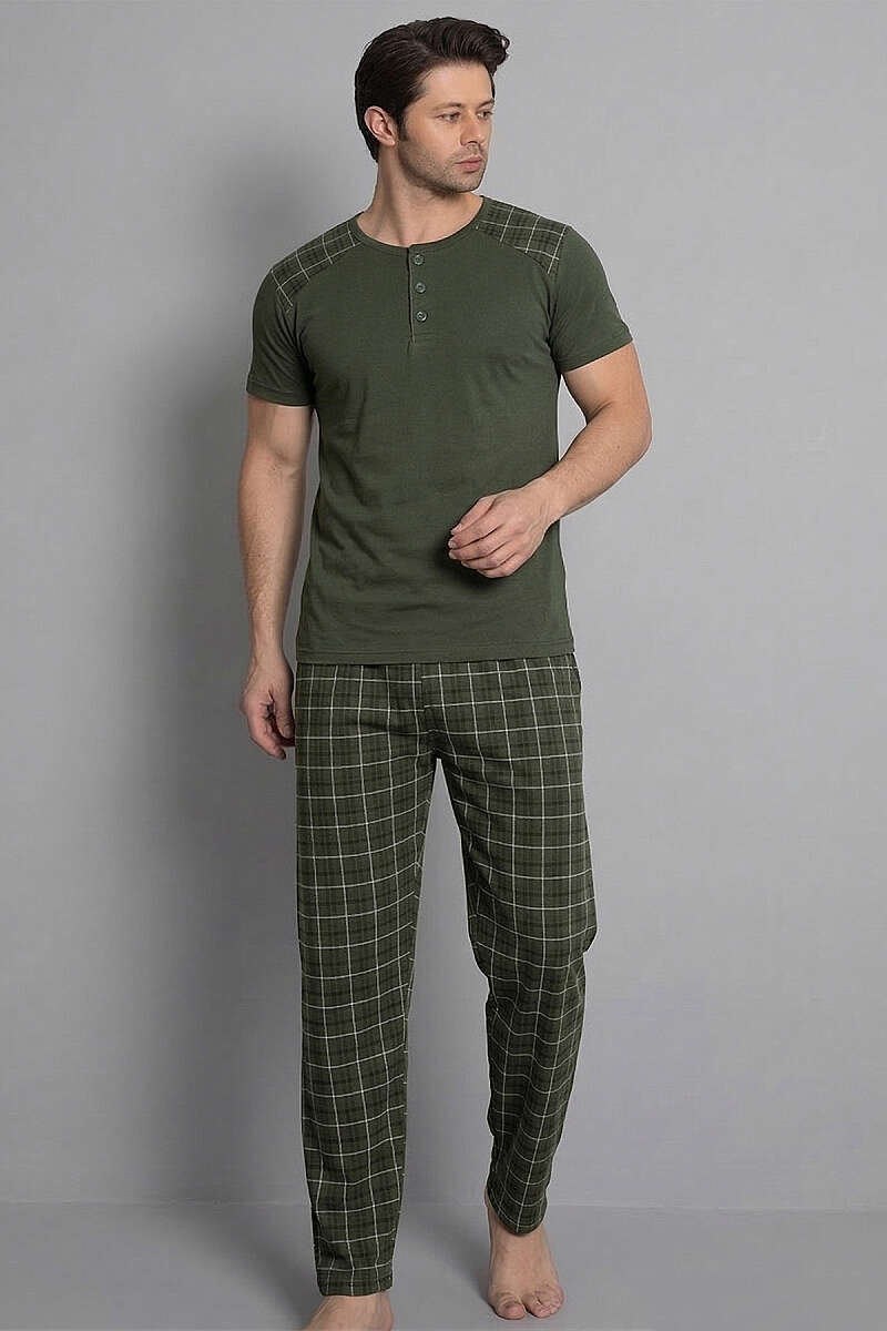 Ekose Garnili Kısa Kol Erkek Pijama Takımı Haki
