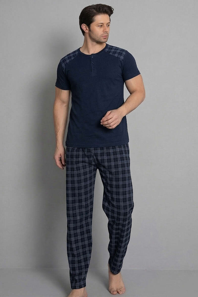 Ekose Garnili Kısa Kol Erkek Pijama Takımı Lacivert