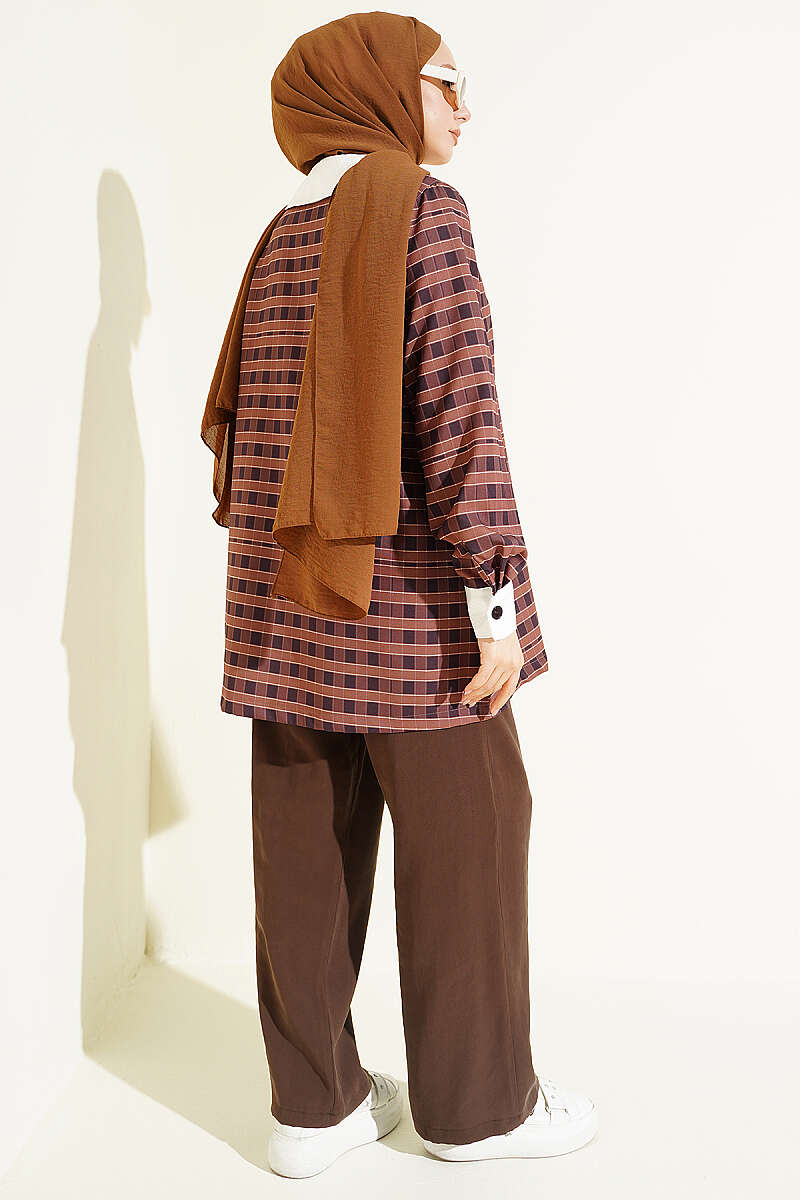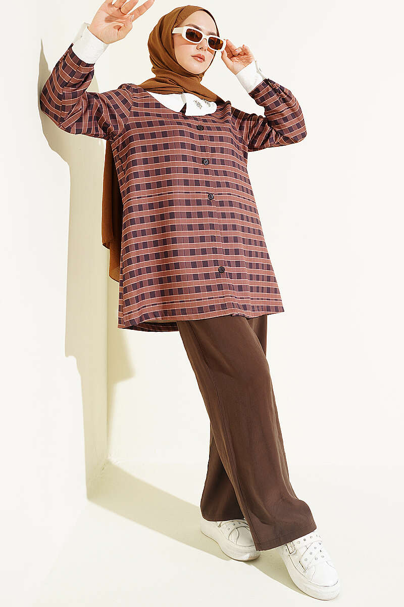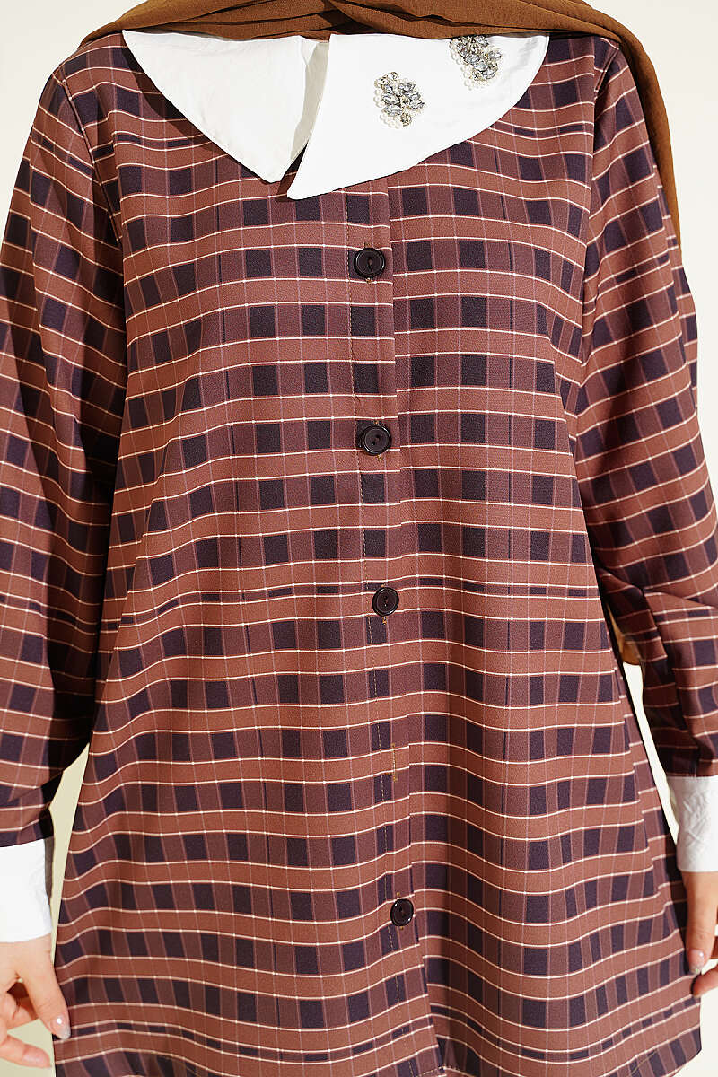 Bu şık gömlek, klasik ekose desenini iddialı ve modern bir yaklaşımla birleştirerek gardırobunuza özgün bir hava katıyor. Tasarımın en dikkat çekici unsuru olan asimetrik geniş yaka, üzerindeki zarif taş işlemeleriyle birleşerek sofistike bir görünüm sergiliyor. Manşetlerdeki kontrast detaylar ve ön kısımda boydan boya uzanan düğme yapısı, gömleğin hem klasik hem de yenilikçi karakterini ön plana çıkarıyor. Dinamik çizgileri ve özgün kesimiyle, stilinde fark yaratmak isteyenler için ideal ve konforlu bir seçenek sunuyor.