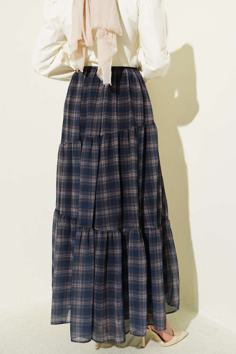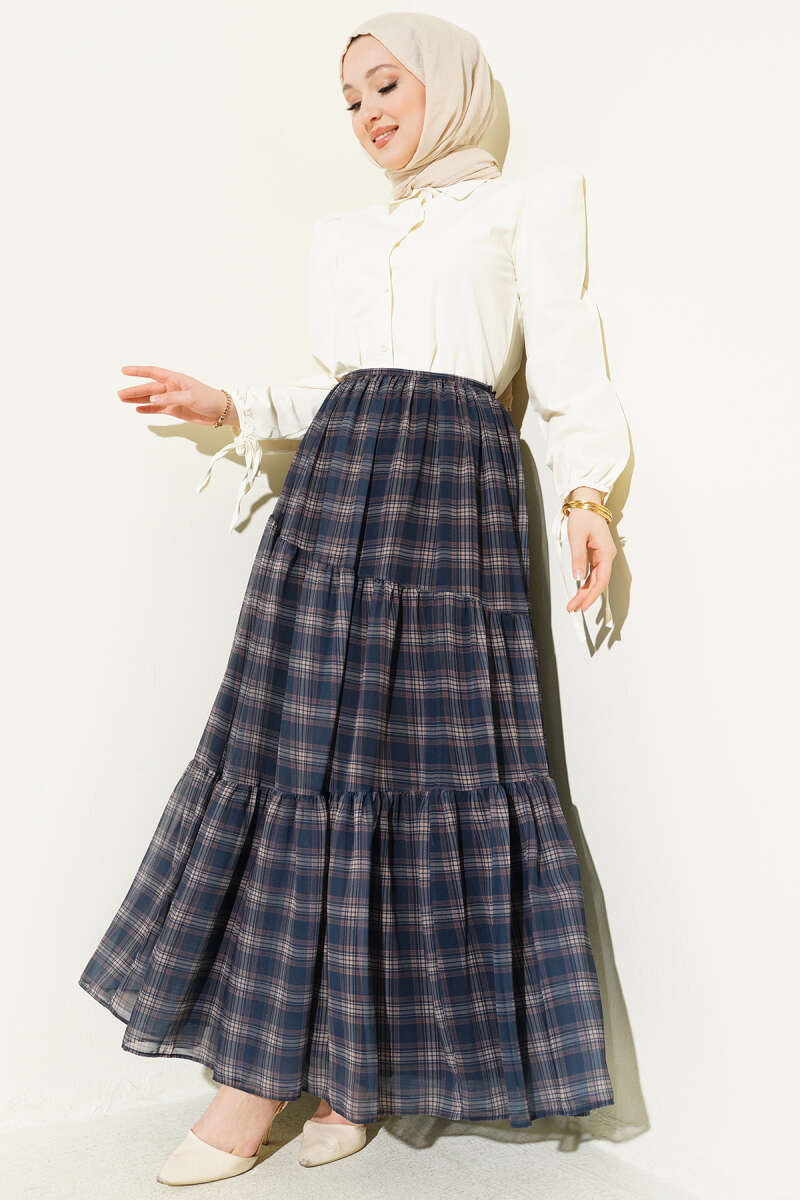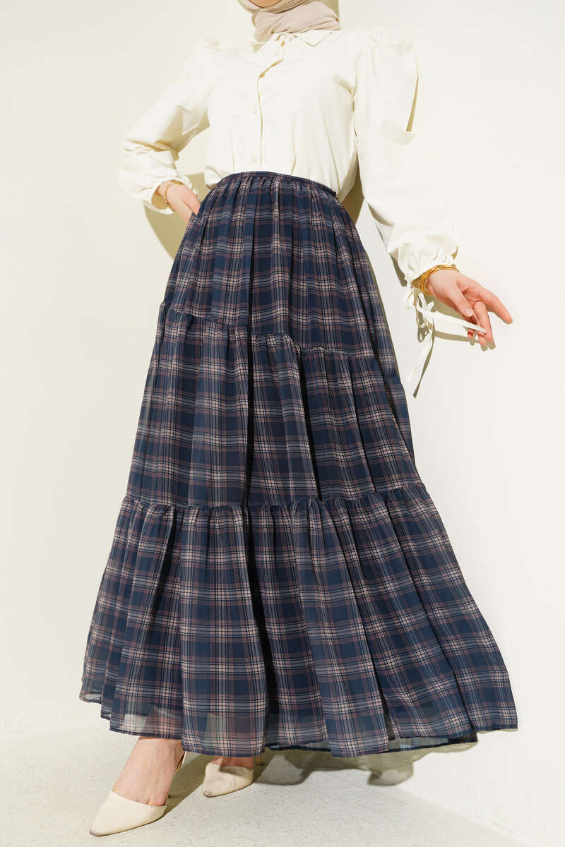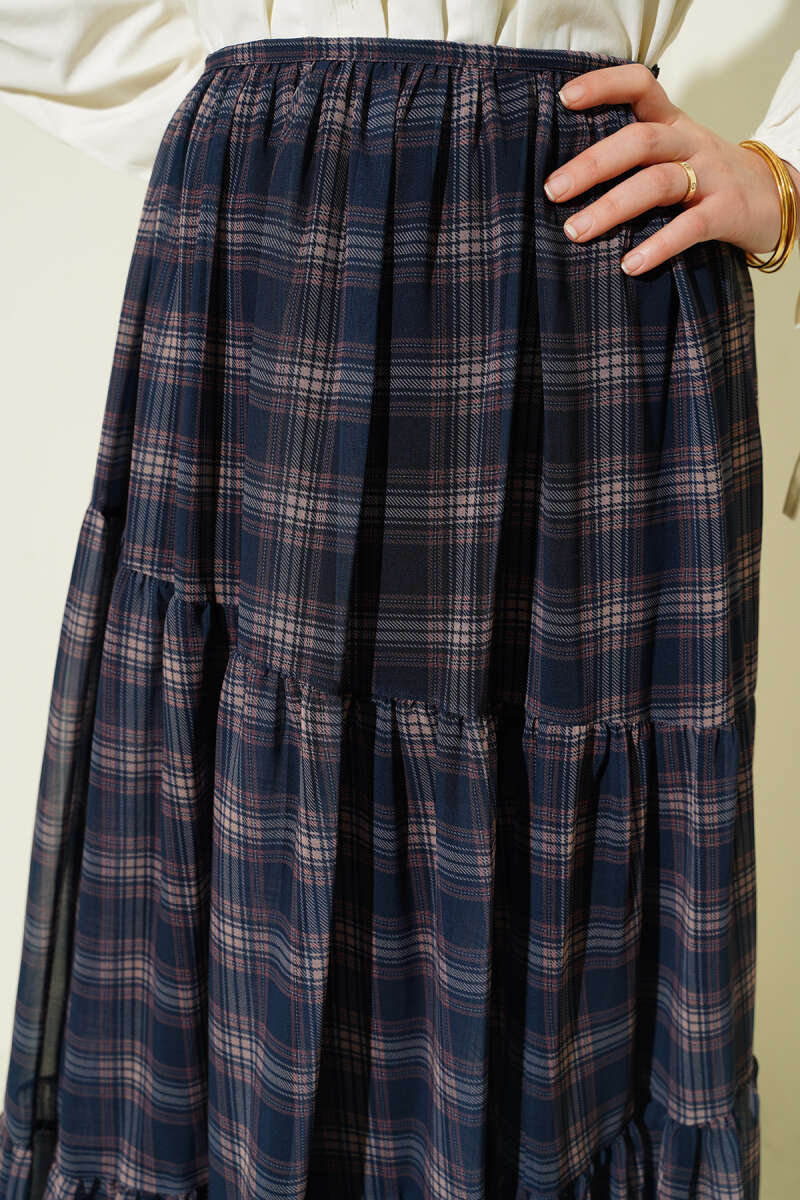 Ekoseli Bel Fermuarlı Şifon Etek İndigo
