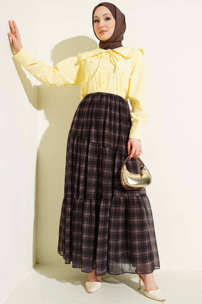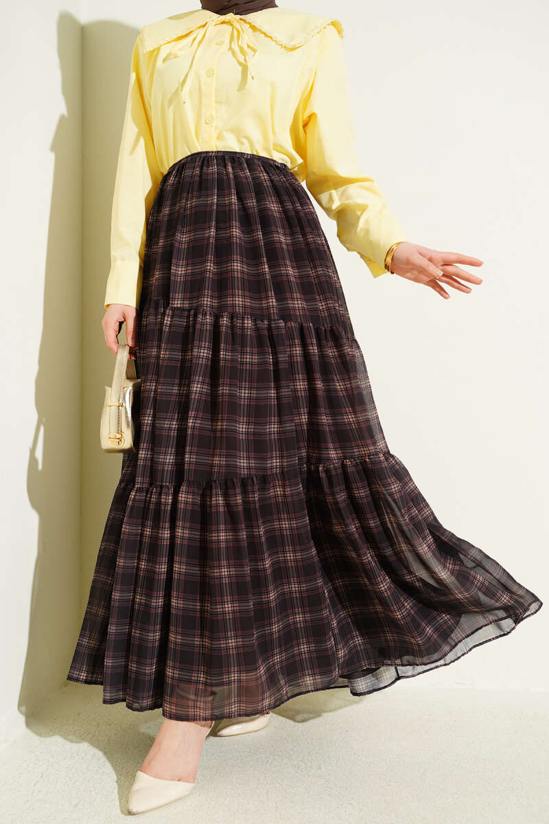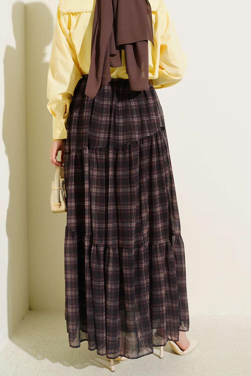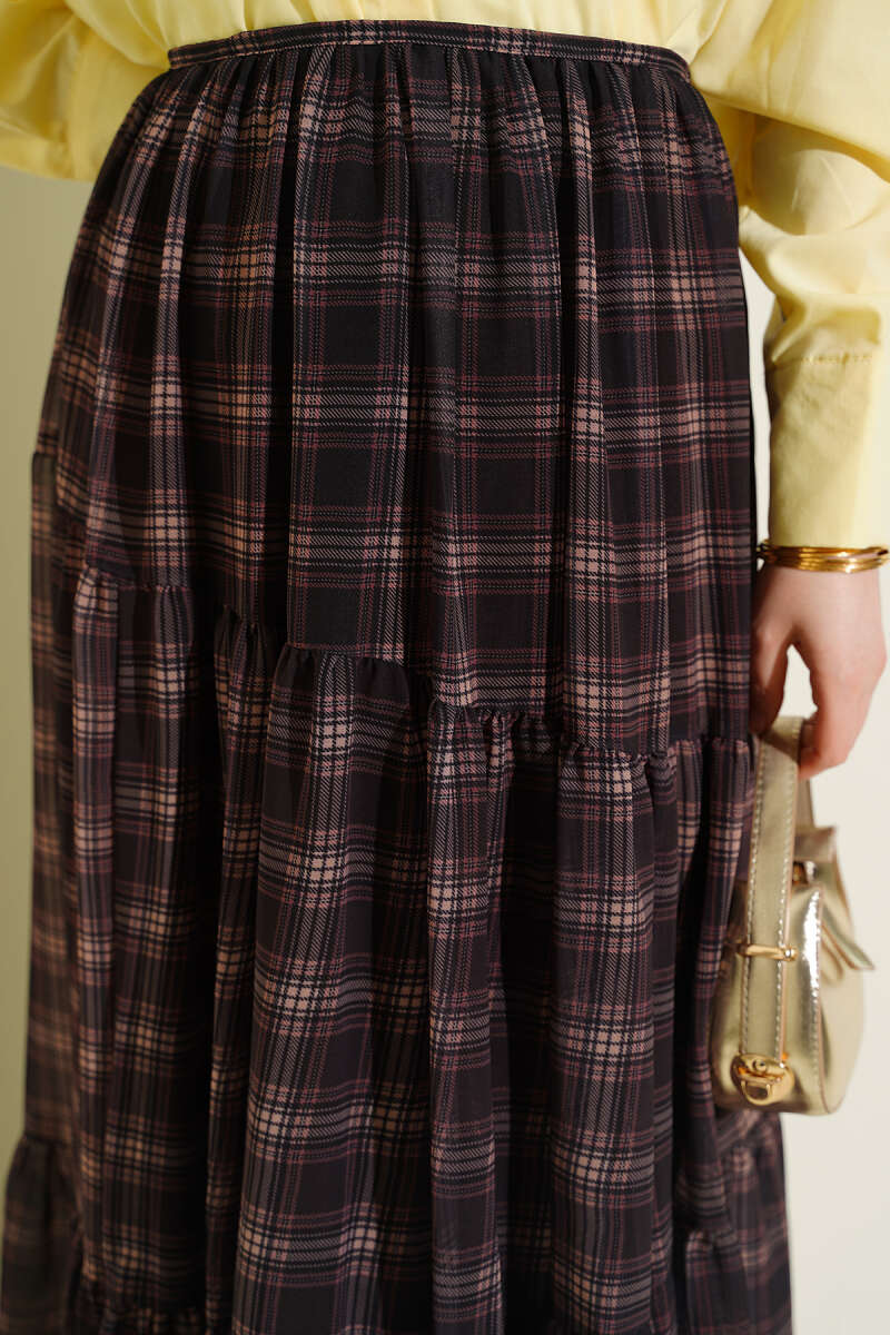 Ekoseli Bel Fermuarlı Şifon Etek Kahve
