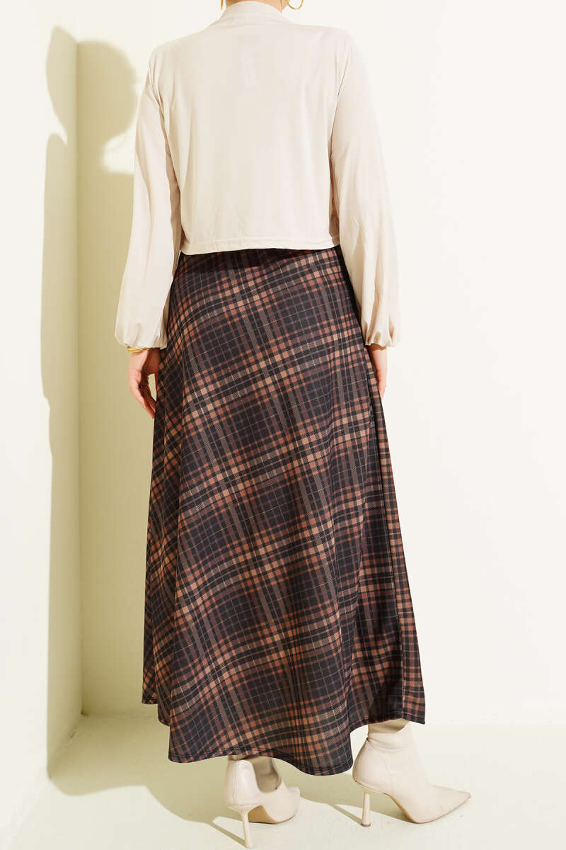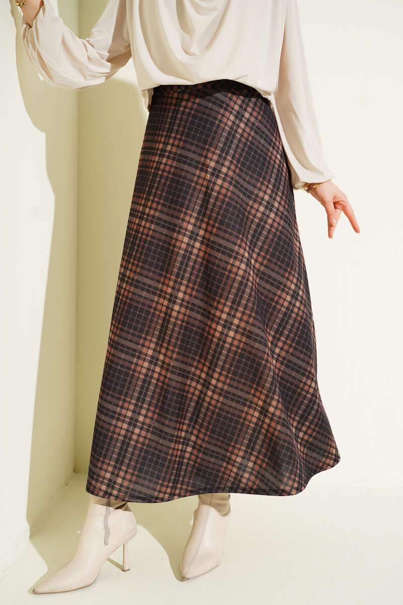 Ekoseli Beli Lastikli Kloş Etek Kahve
