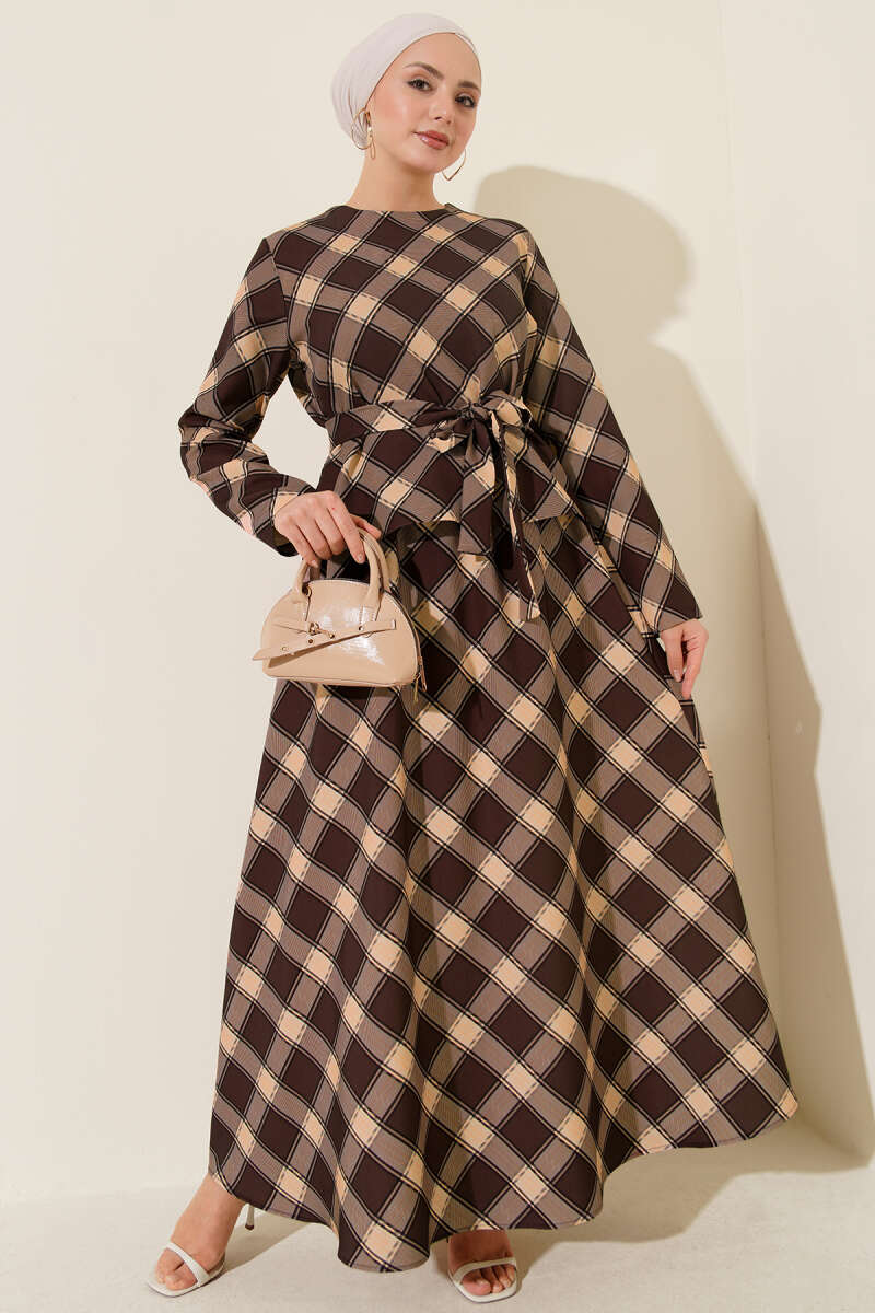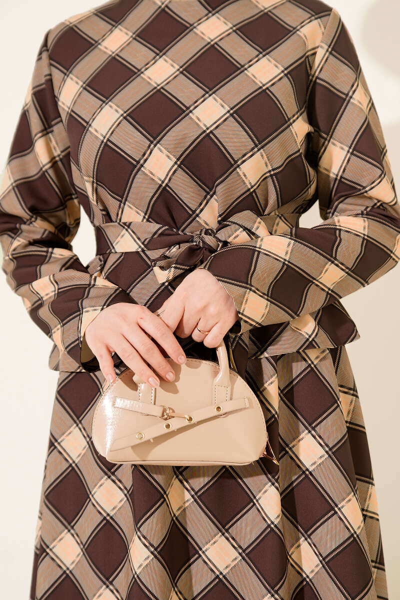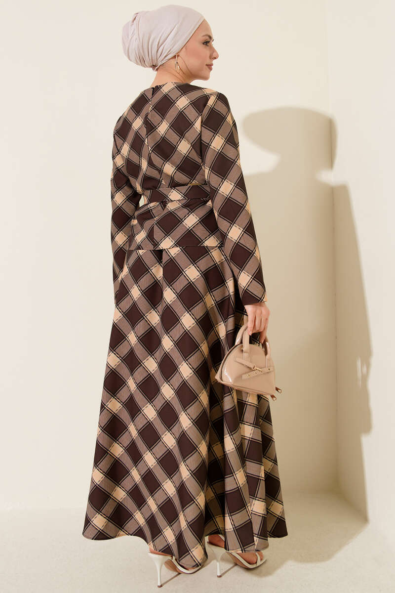 Ekoseli Desenli Etekli Bluzlu Takım Kahve