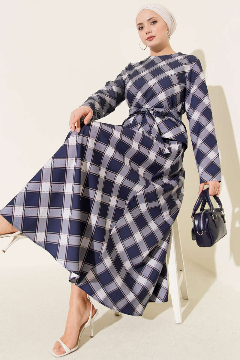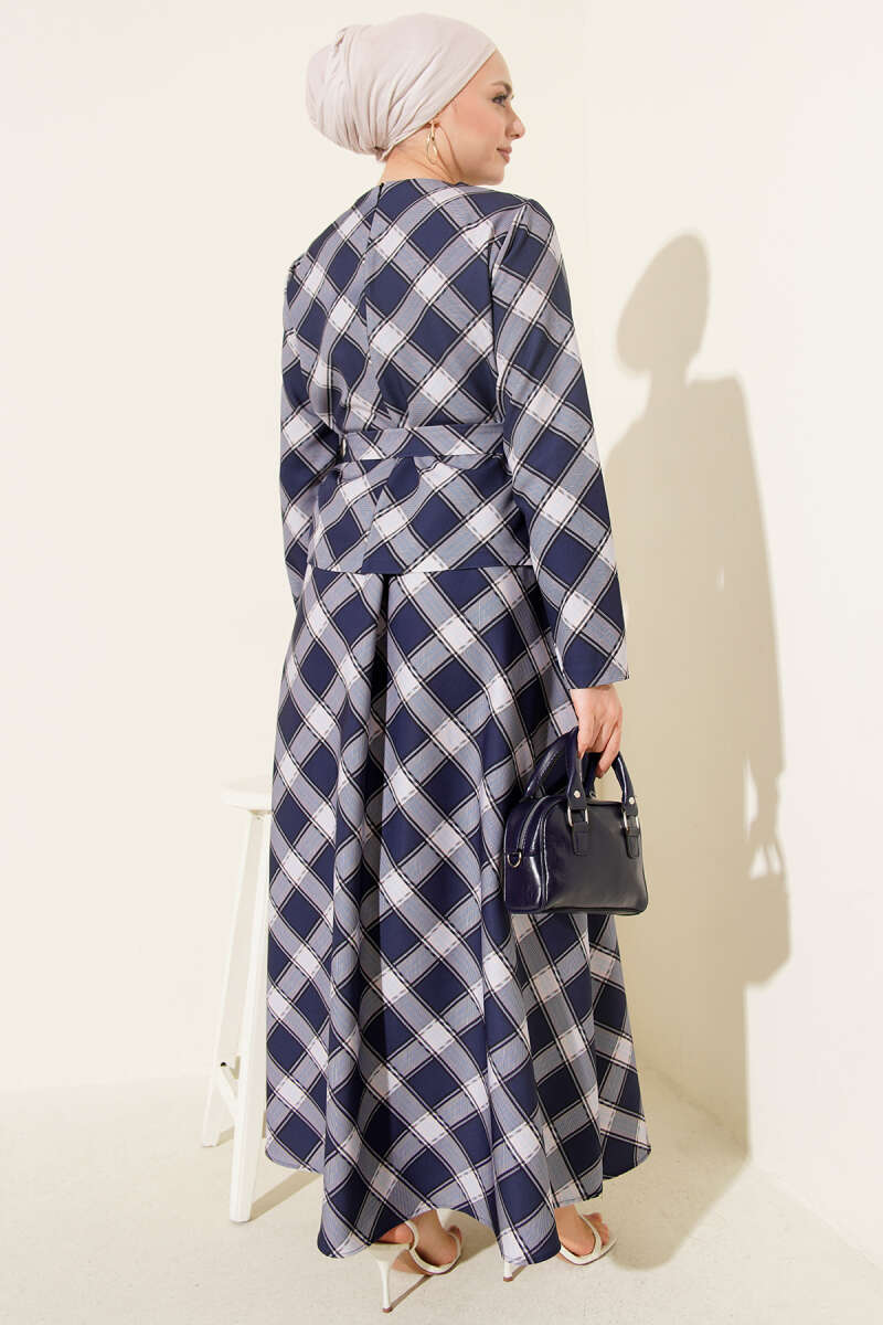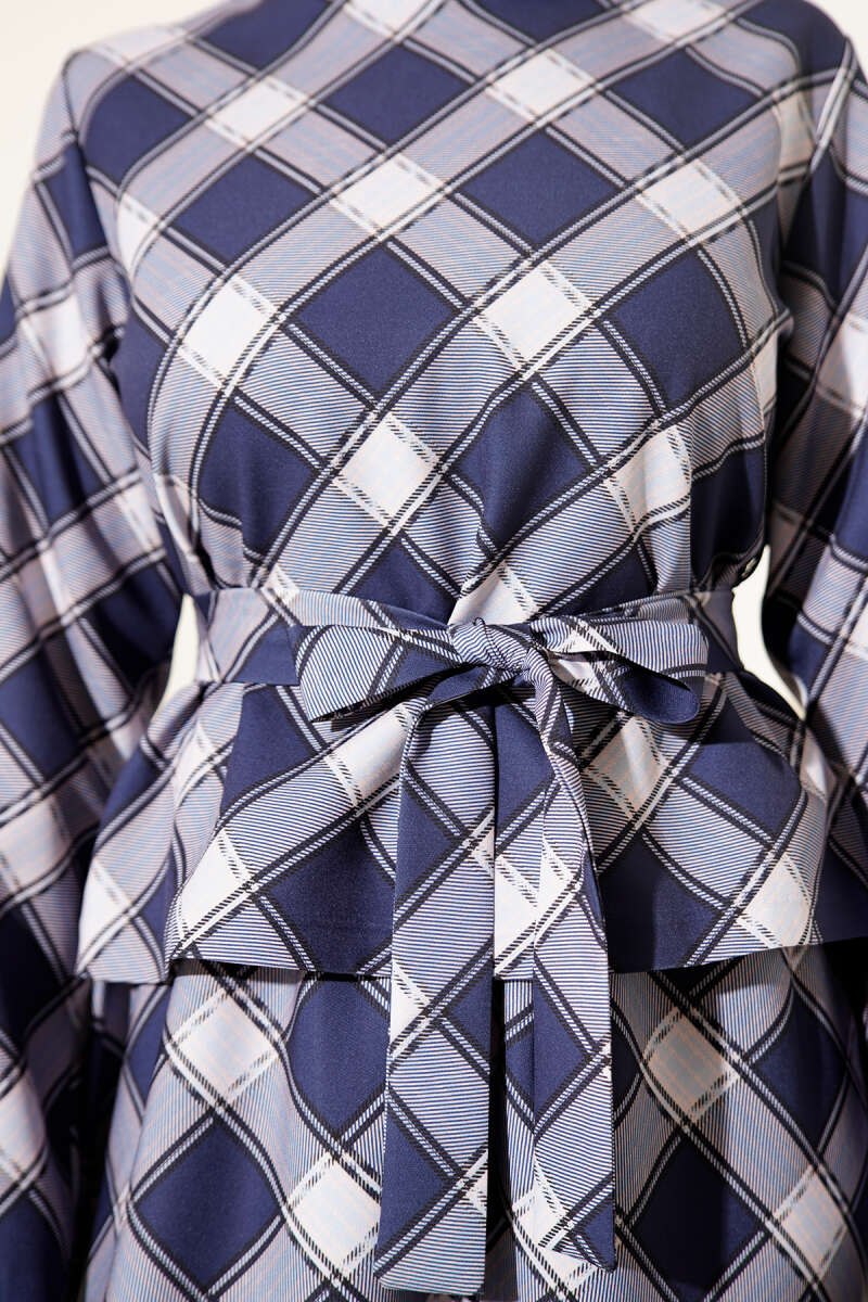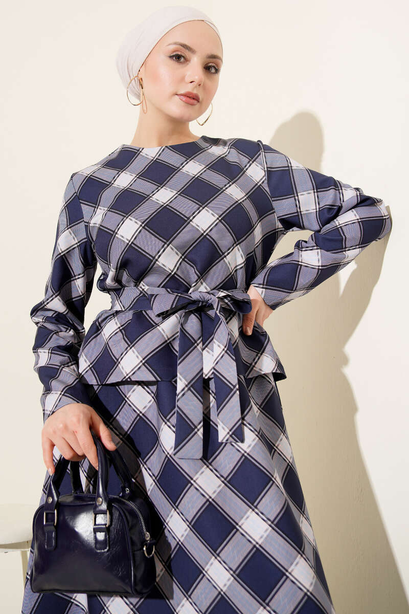 Ekoseli Desenli Etekli Bluzlu Takım Lacivert