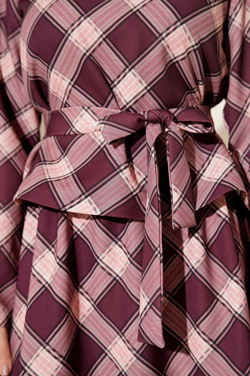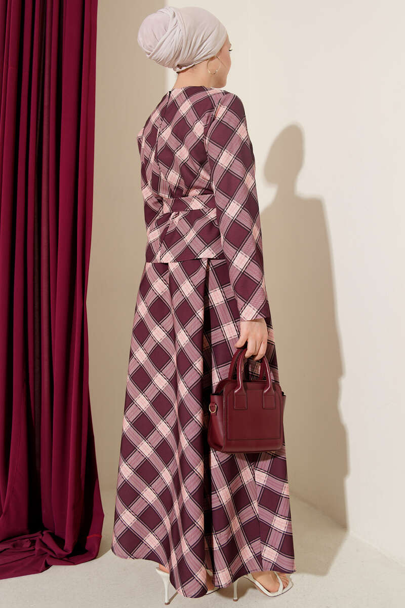 Ekoseli Desenli Etekli Bluzlu Takım Mürdüm