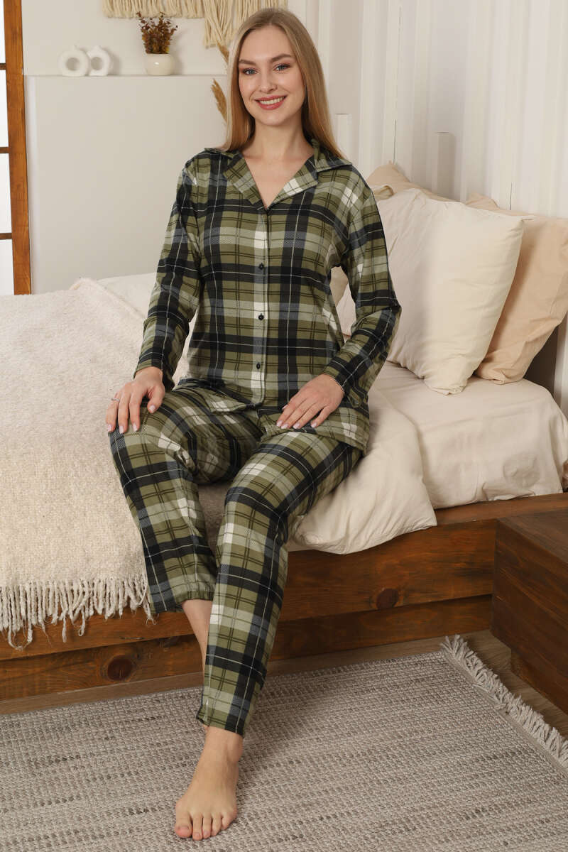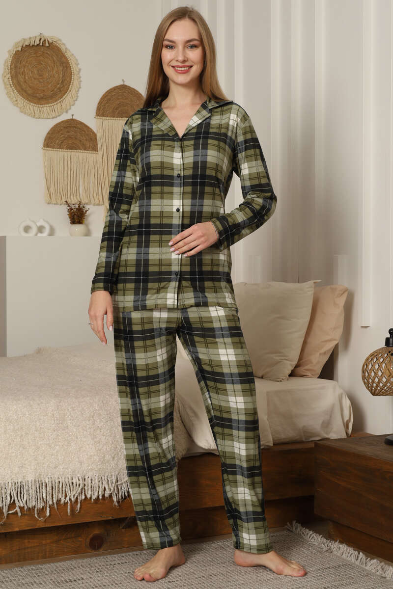 Ekoseli Düğmeli Süet Pijama Takımı Haki