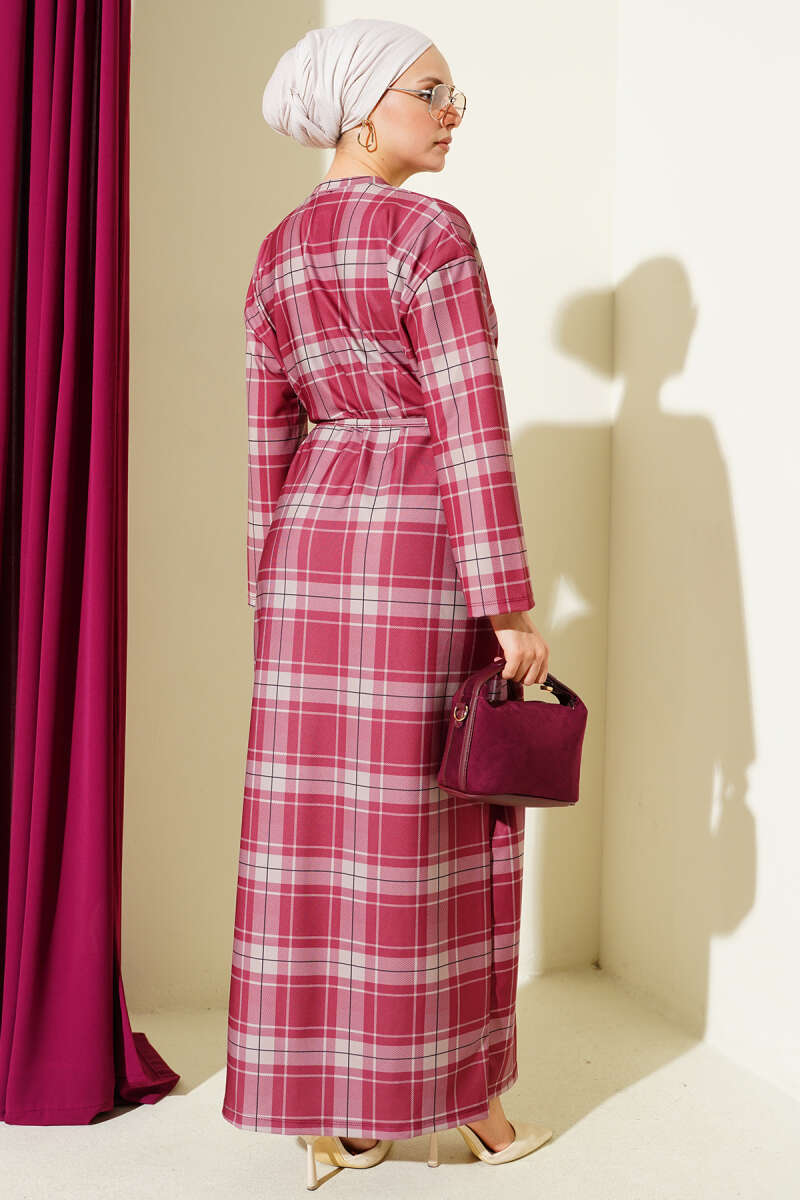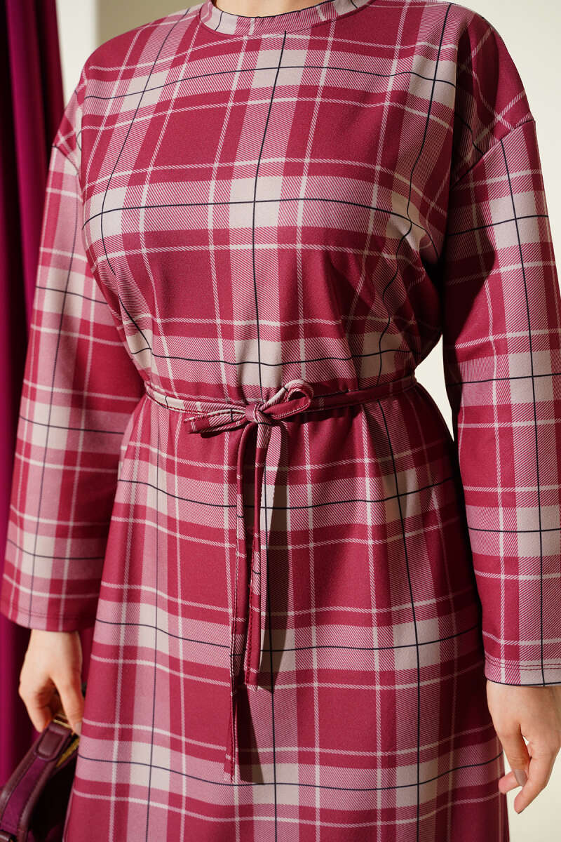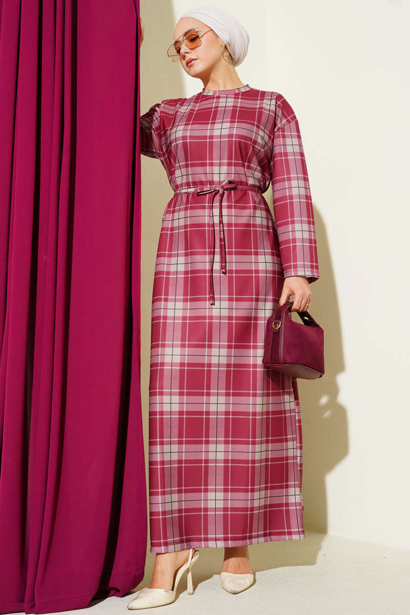 Ekoseli İp Kuşaklı Elbise Füme