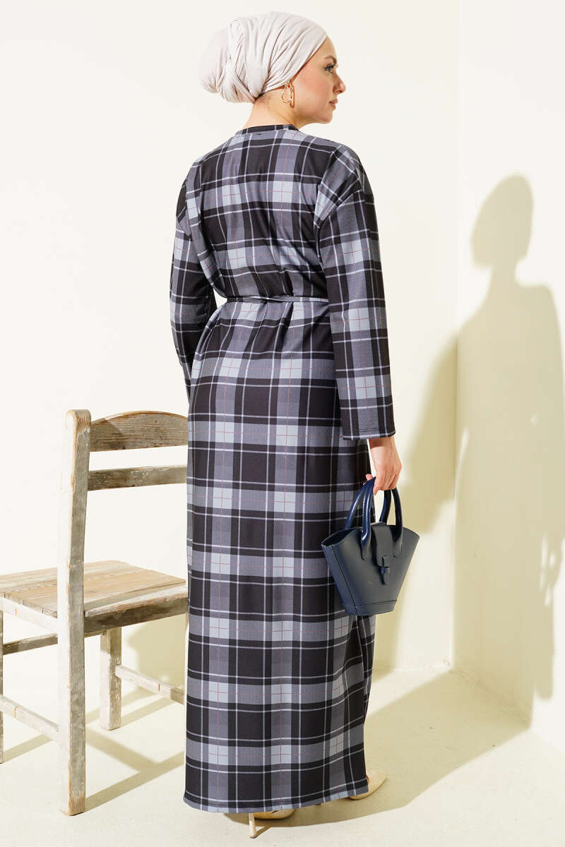 Ekoseli İp Kuşaklı Elbise Siyah