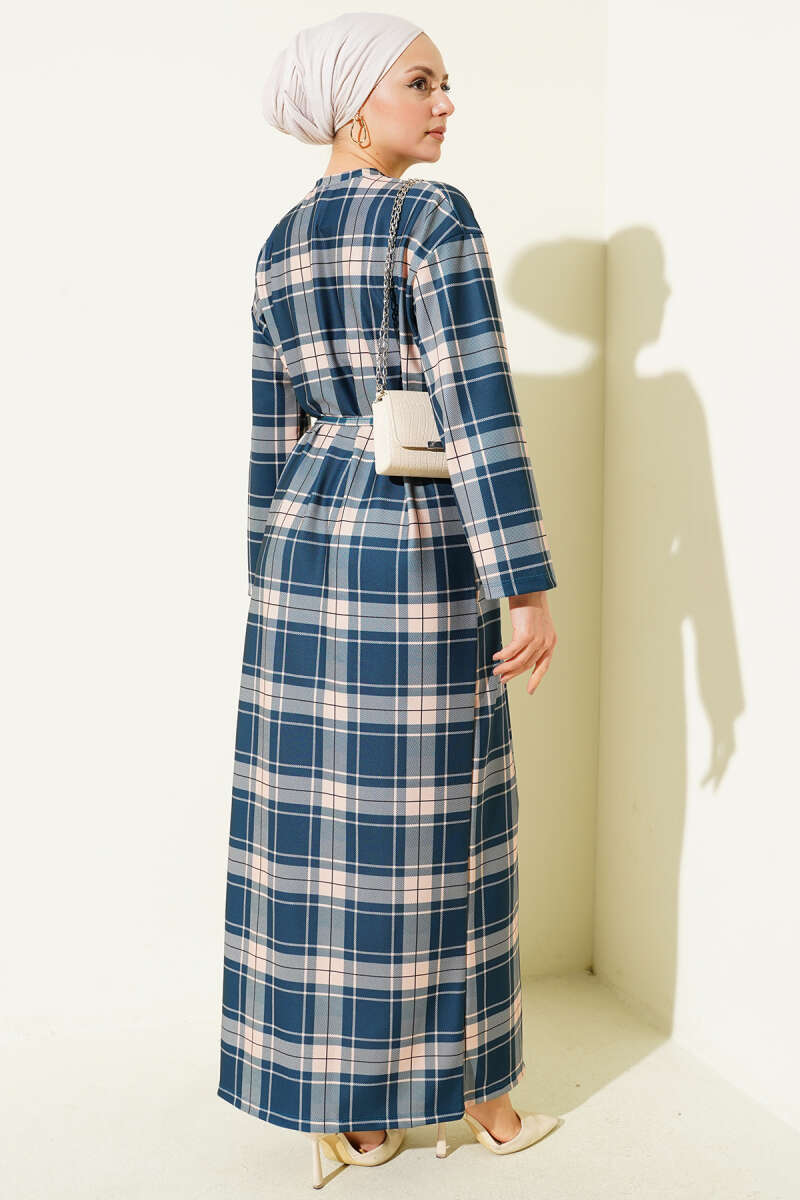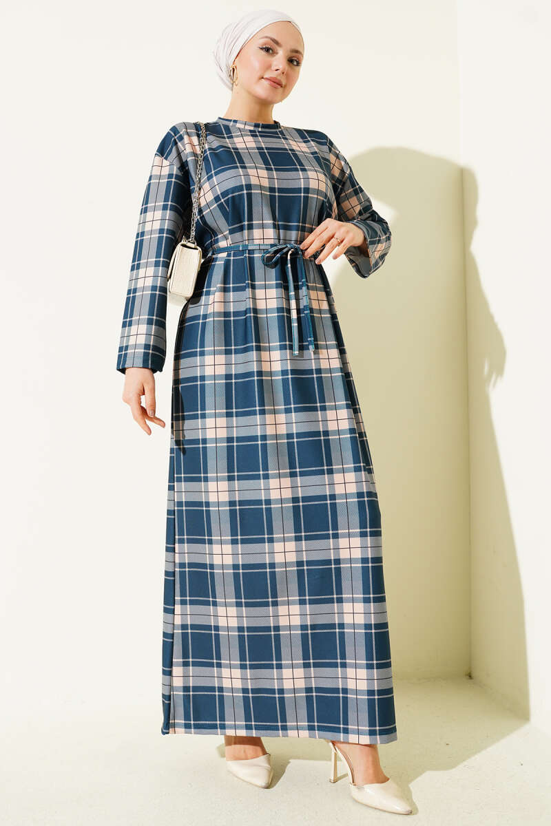 Ekoseli İp Kuşaklı Elbise Füme