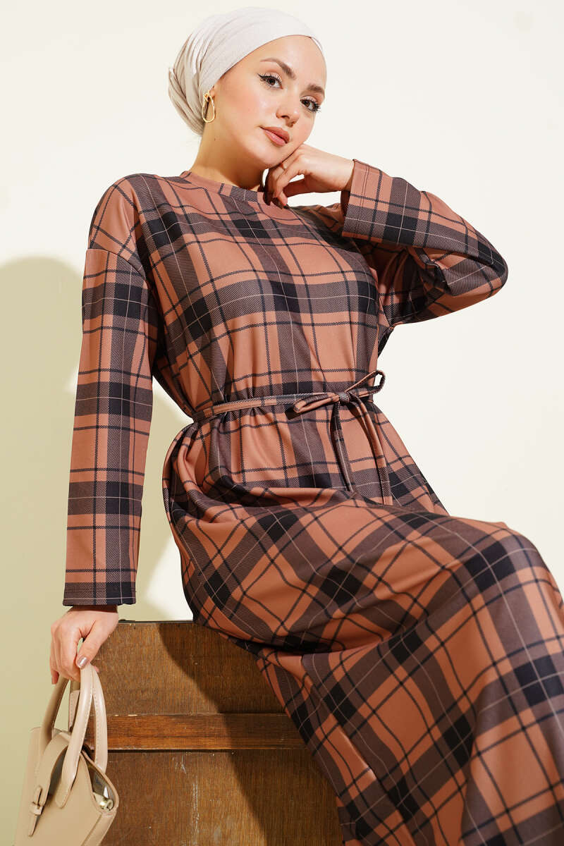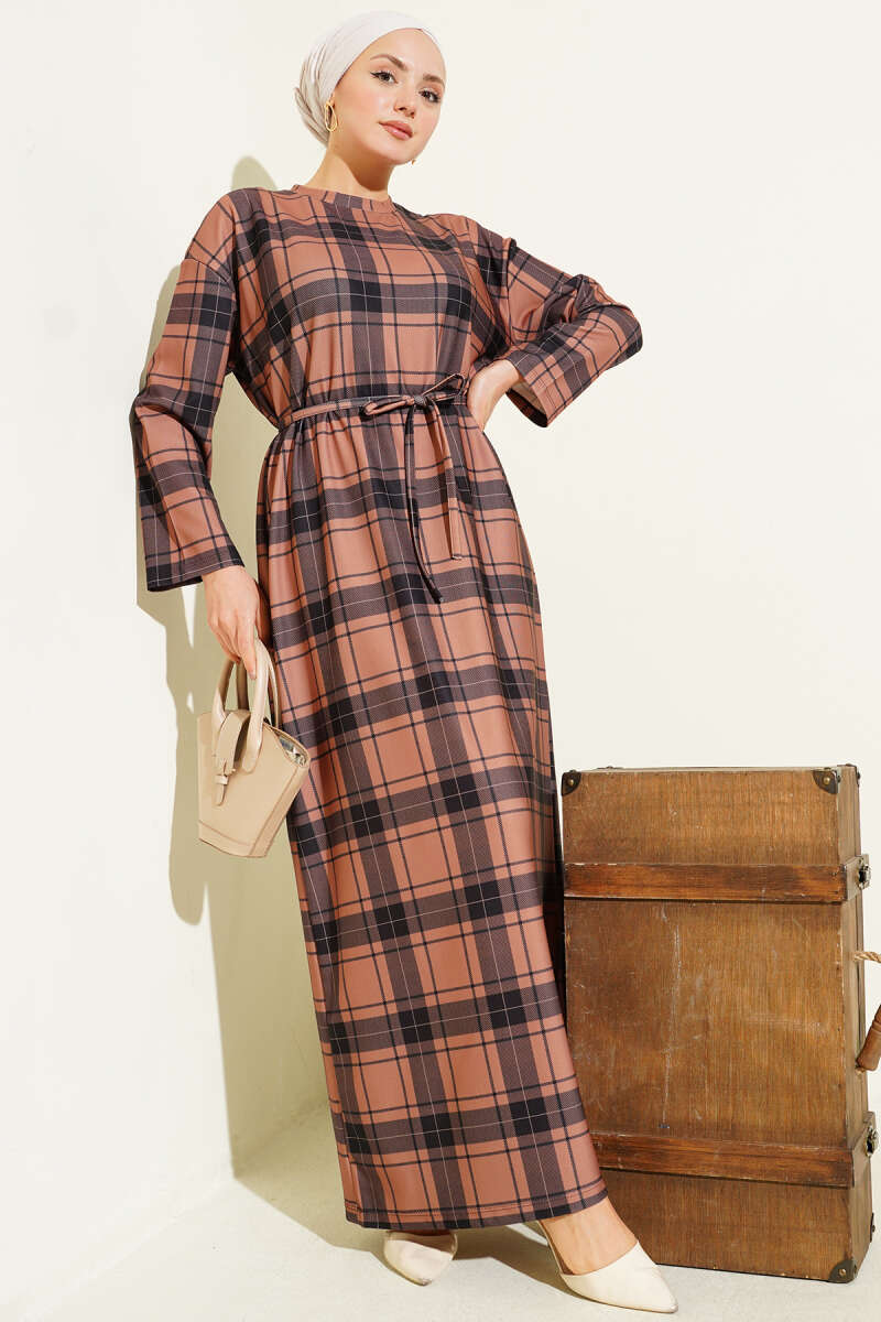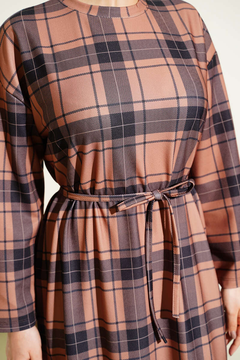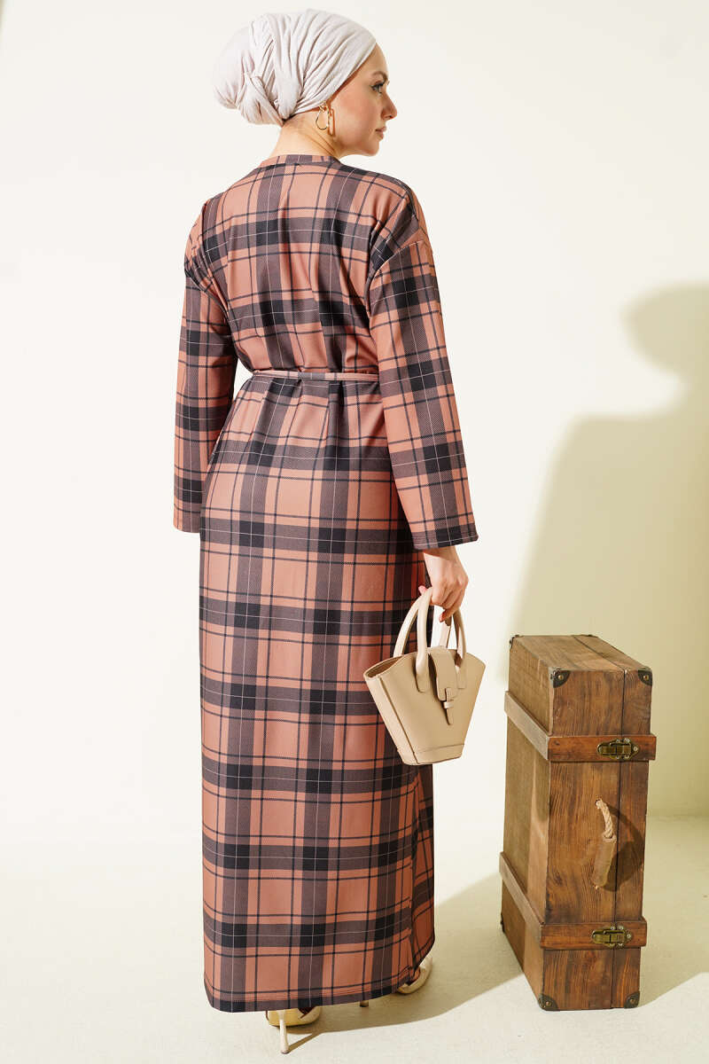 Ebru Desen Yarım Düğmeli Elbise Taba