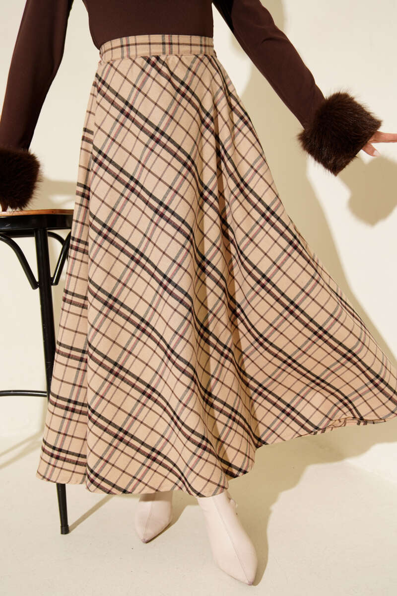 Bel Lastikli Ekoseli Scuba Etek Kahve