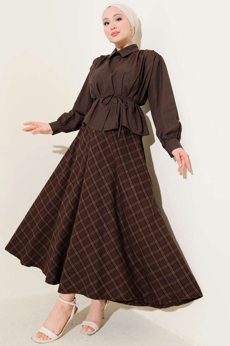 Bel Lastikli Kemerli Saten Etek Kahve