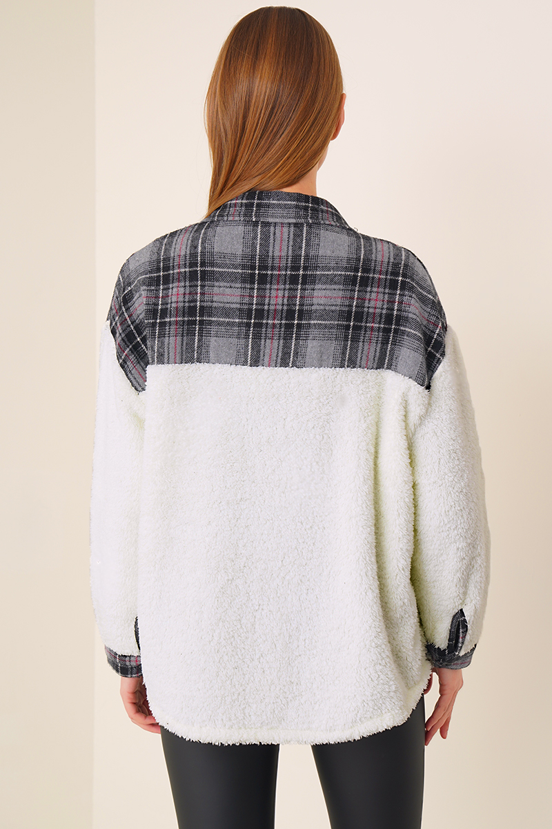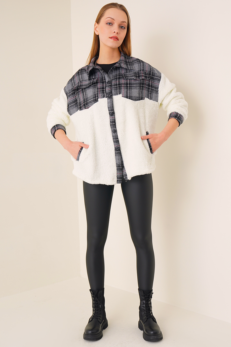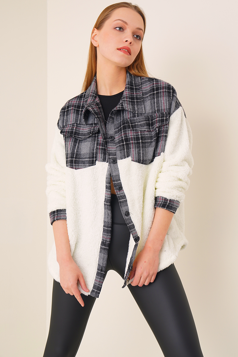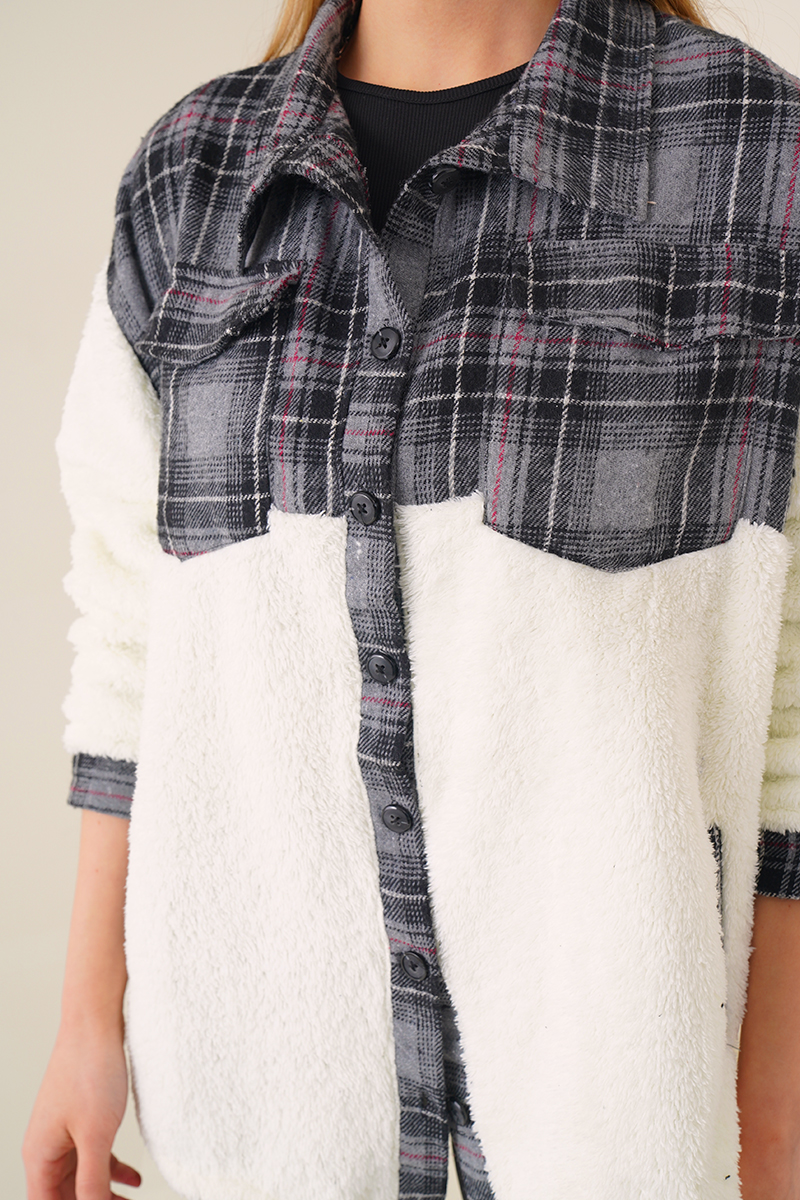 Spor görünüm ve sıcacık bir etki. Ekose desenli peluş ile sende tarz görünürken soğuklara karşı kendini koruyabilirsin. Klasik yakalı olan ceket önü düğmelidir. Ön kısmında cepleri olan ceket yeni sezondur. Tek renktir.