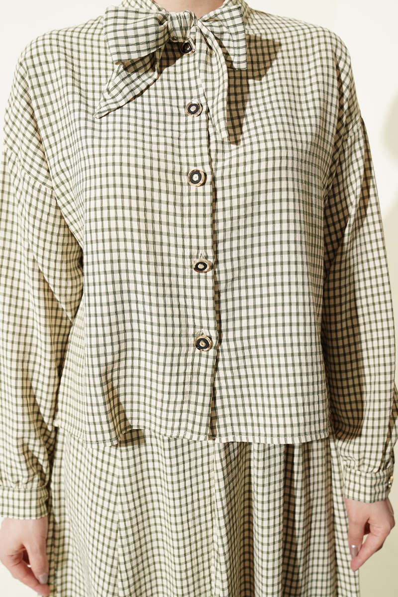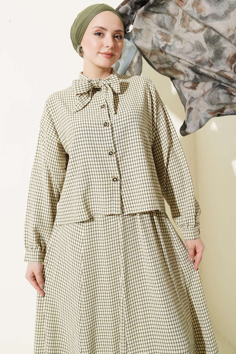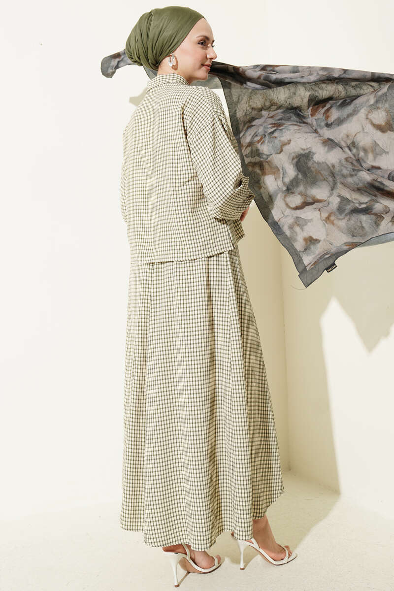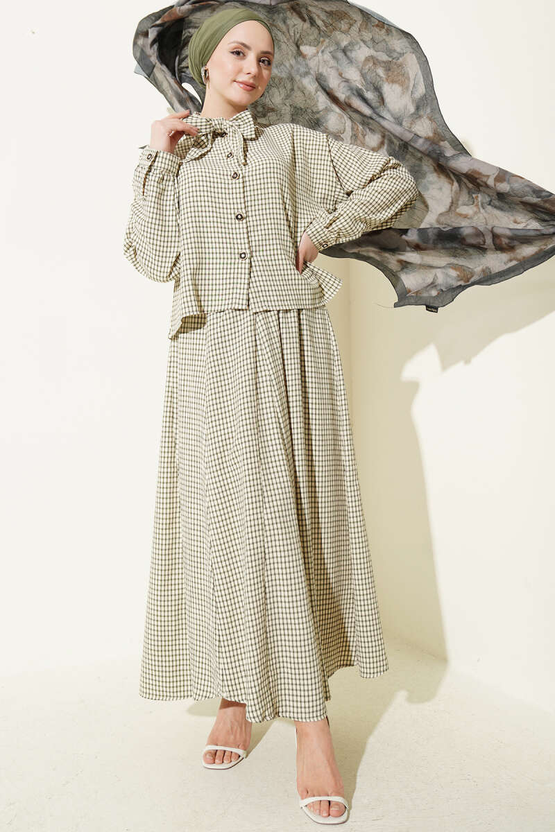 Ekoseli Yaka Bağlamalı Etekli Takım Zümrüt