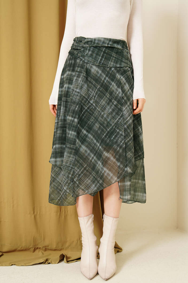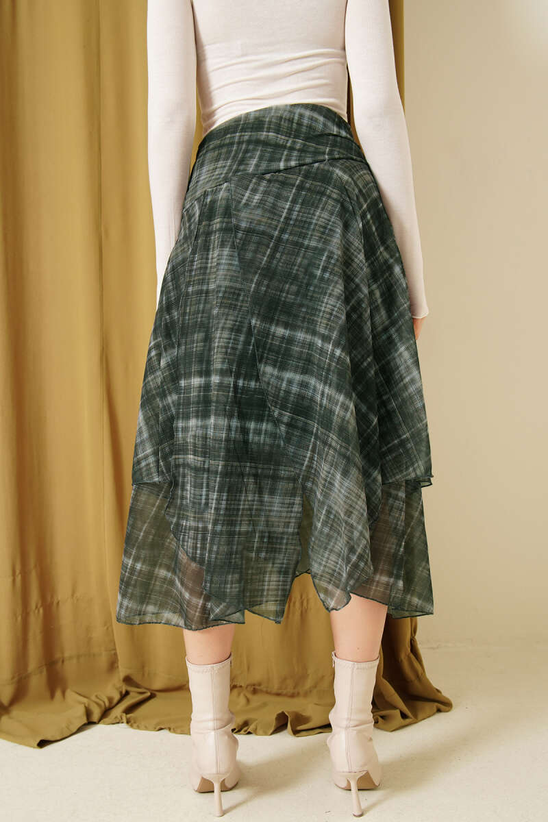 Ekoseli Yırtmaçlı Şifon Midi Etek Zümrüt