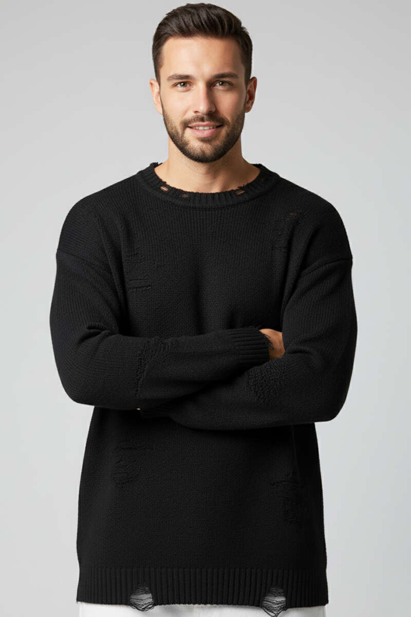 Yıpratma Detaylı Triko Erkek Kazak Kemik