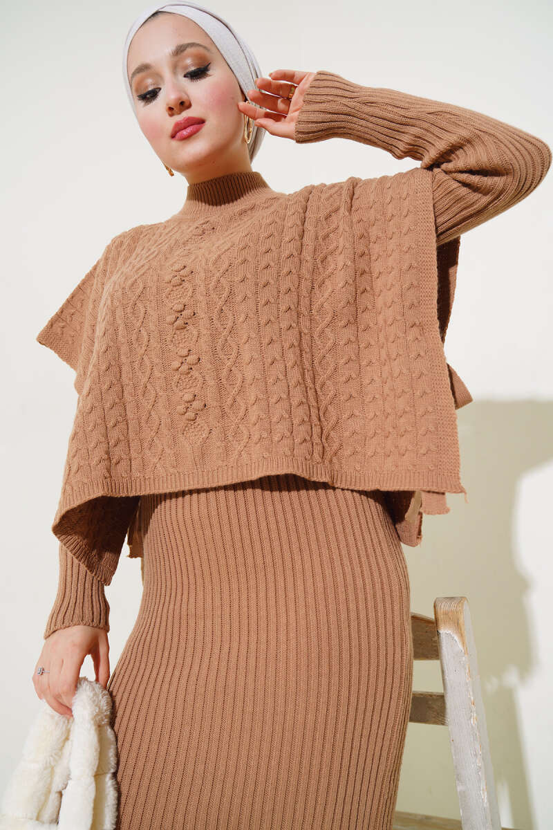 Taşlı Baklava Desen Triko İkili Takım Bej