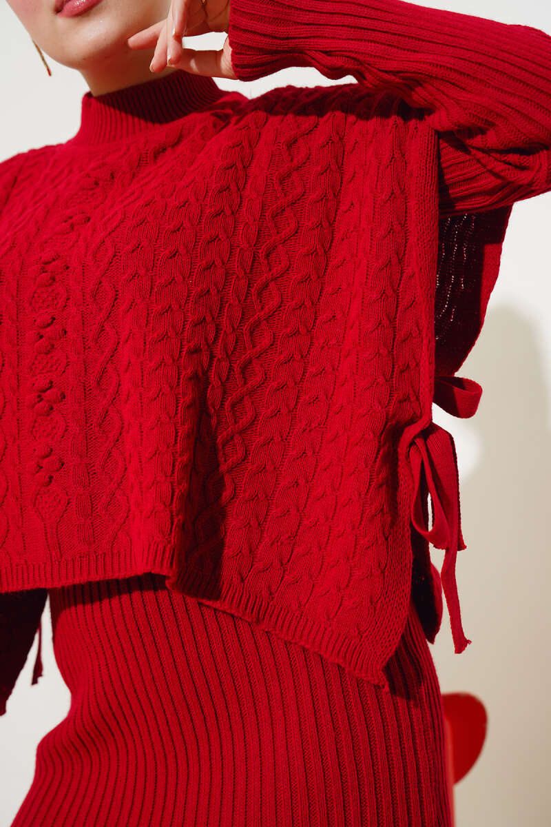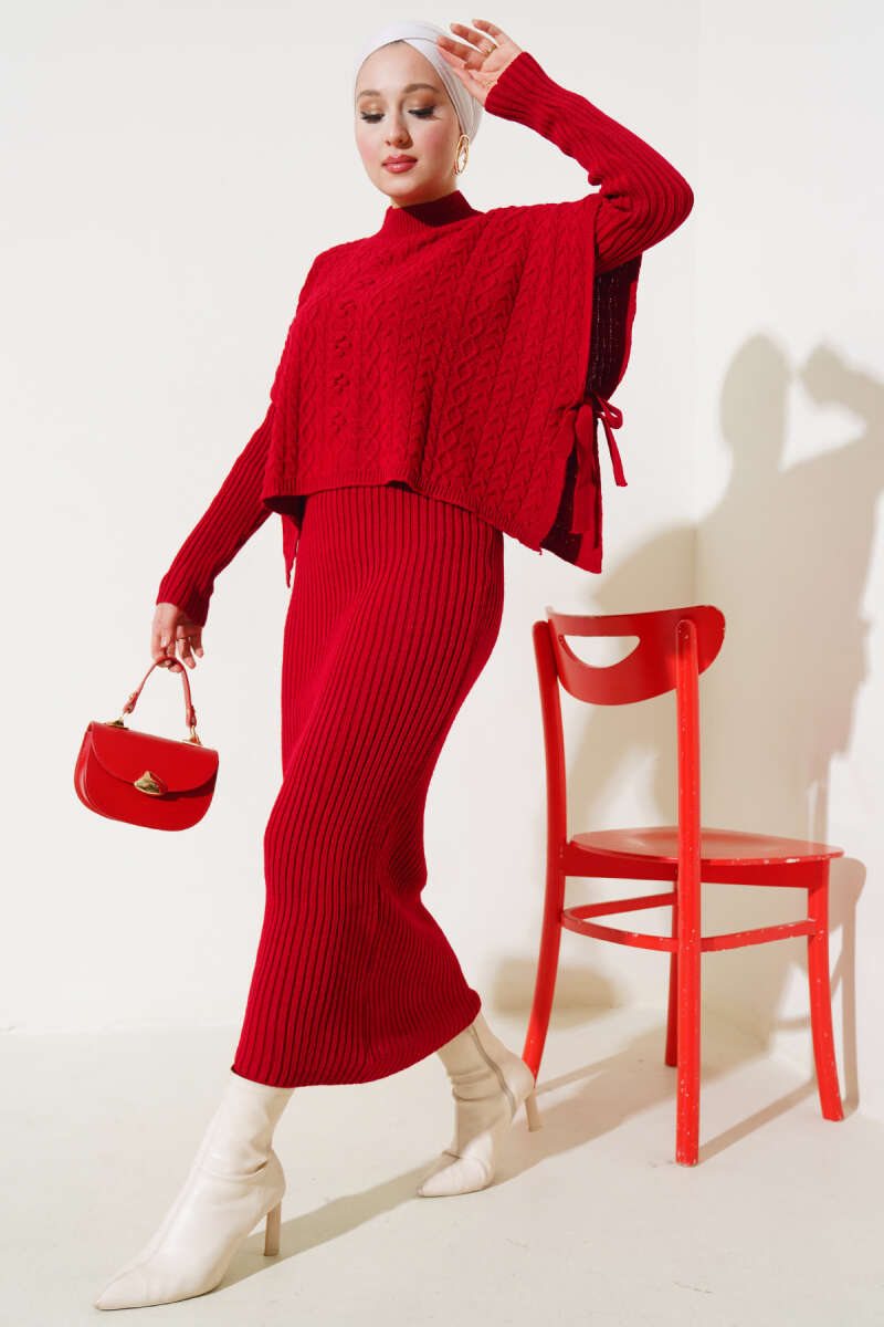 Fitilli Yatay Çizgili Triko İkili Takım Bordo